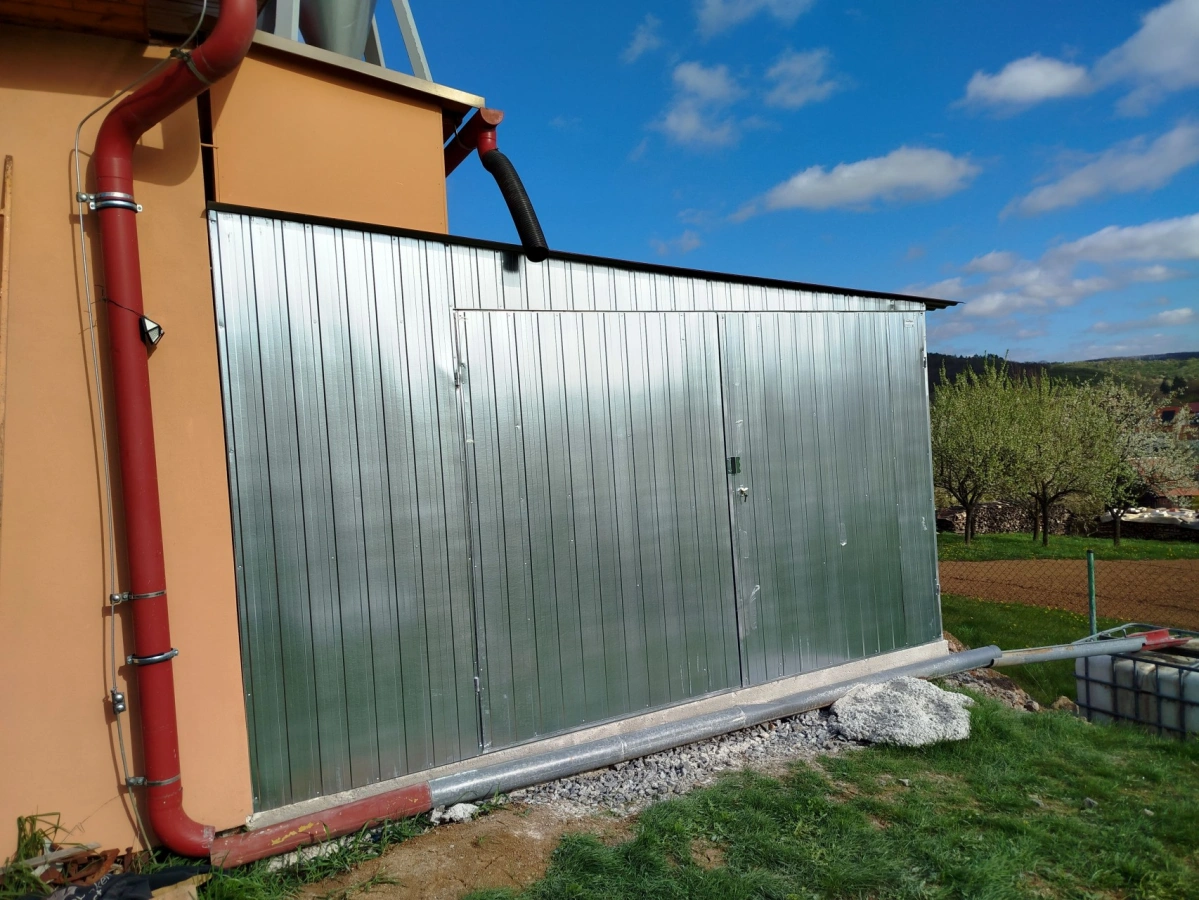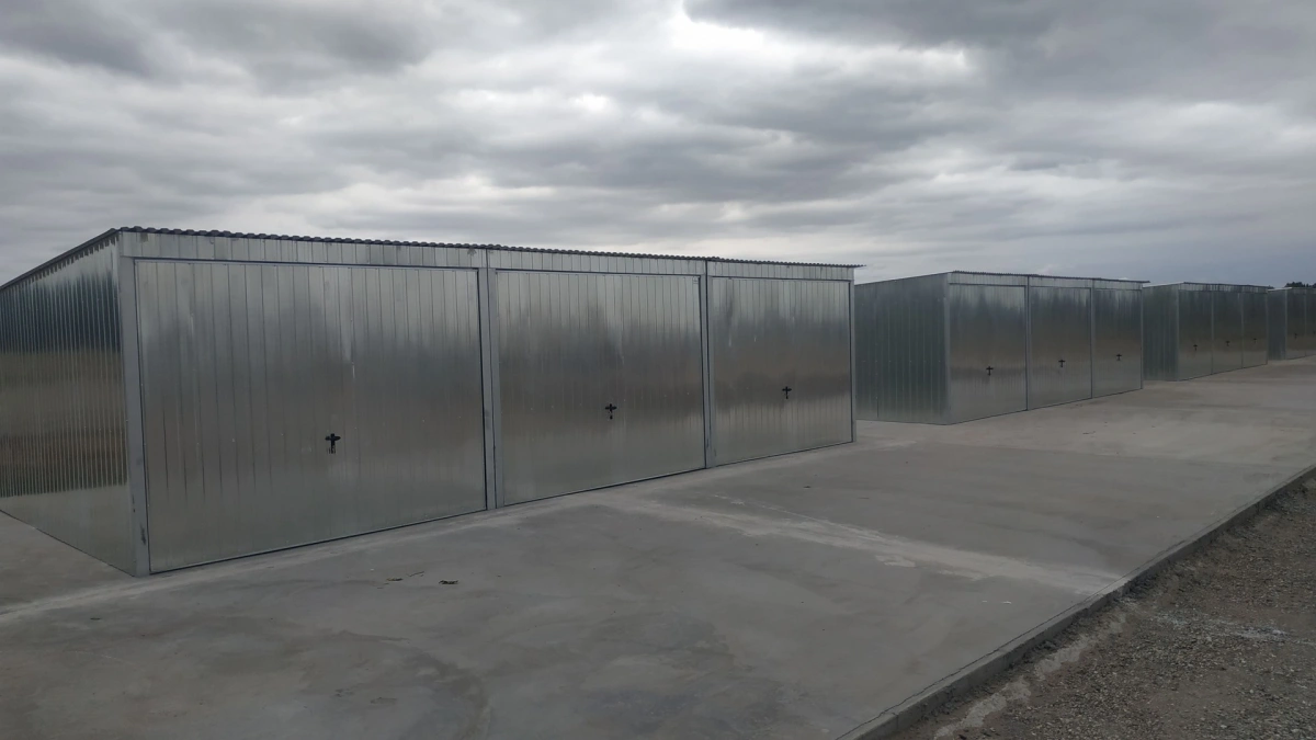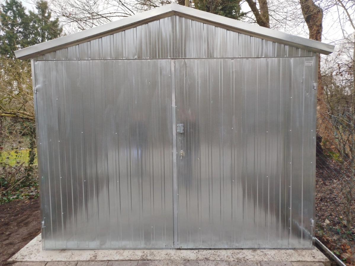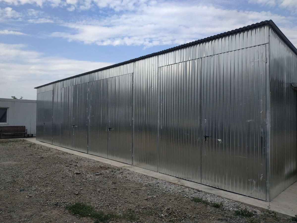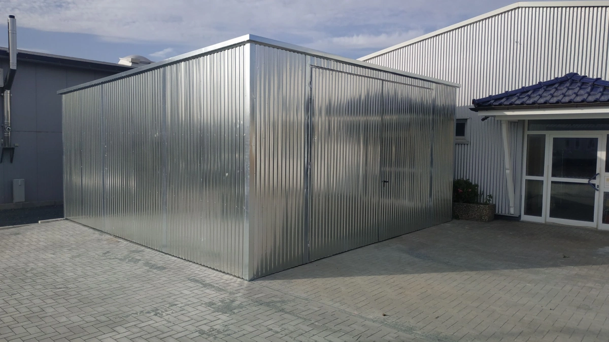 Garaż blaszany o wymiarach 5,9m x 5m (podwójny) - 2 bramy dwuskrzydłowe i spadem dachu w tył. Konstrukcja wykonana z kątowników zimnogiętych ocynkowanych. Ściany garażu pokryte są blachą ocynkowaną (trapez T-7), dach garażu pokryty jest blachą ocynkowaną (trapez T-12). Blacha do konstrukcji mocowana jest nitami, natomiast gotowe elementy skręcane są ze sobą za pomocą śrub. Blaszak standardowo wyposażony jest w 2 bramy dwuskrzydłowe z dwoma ryglami oraz zamek z wkładką patentową na klucz.