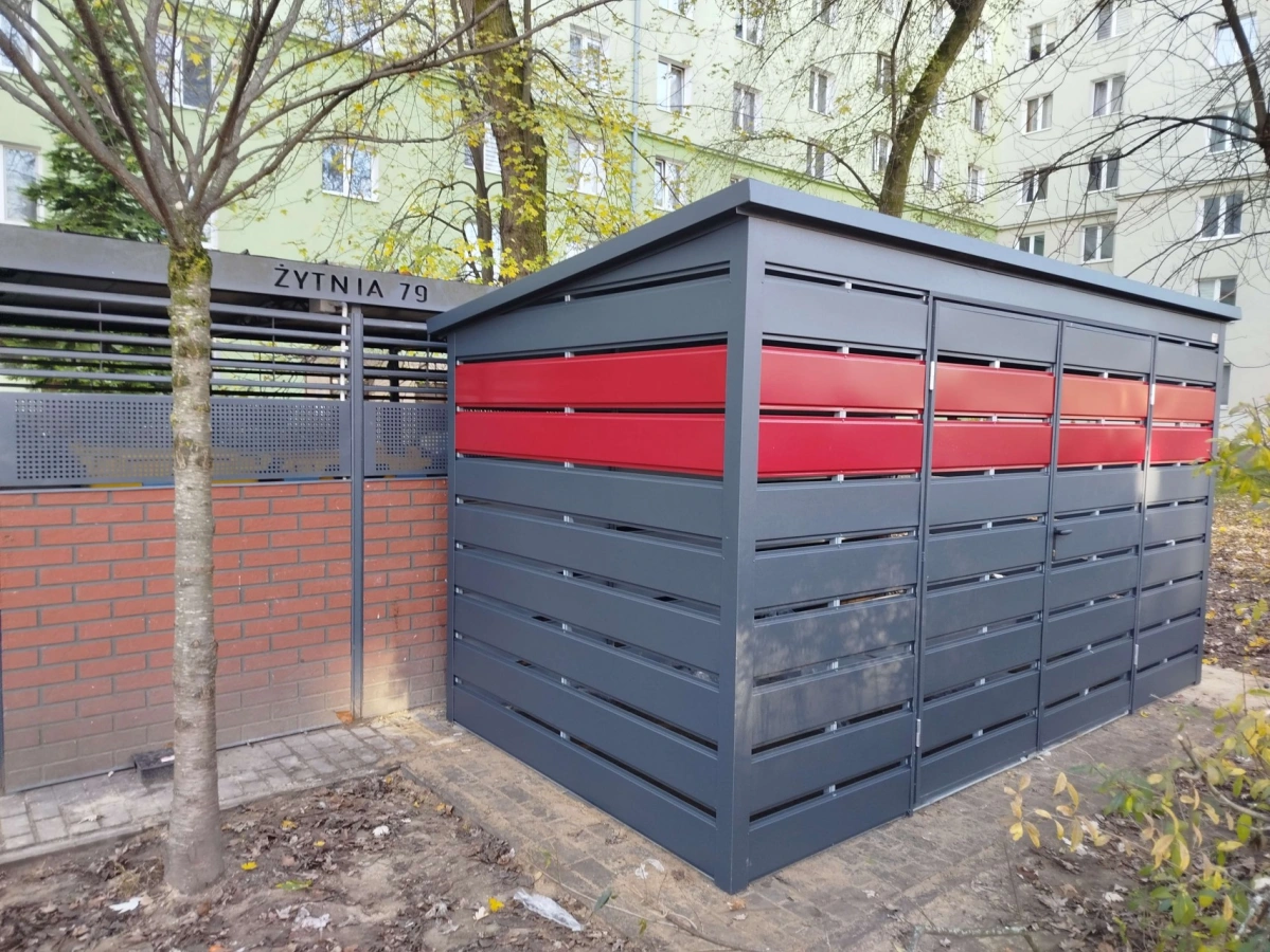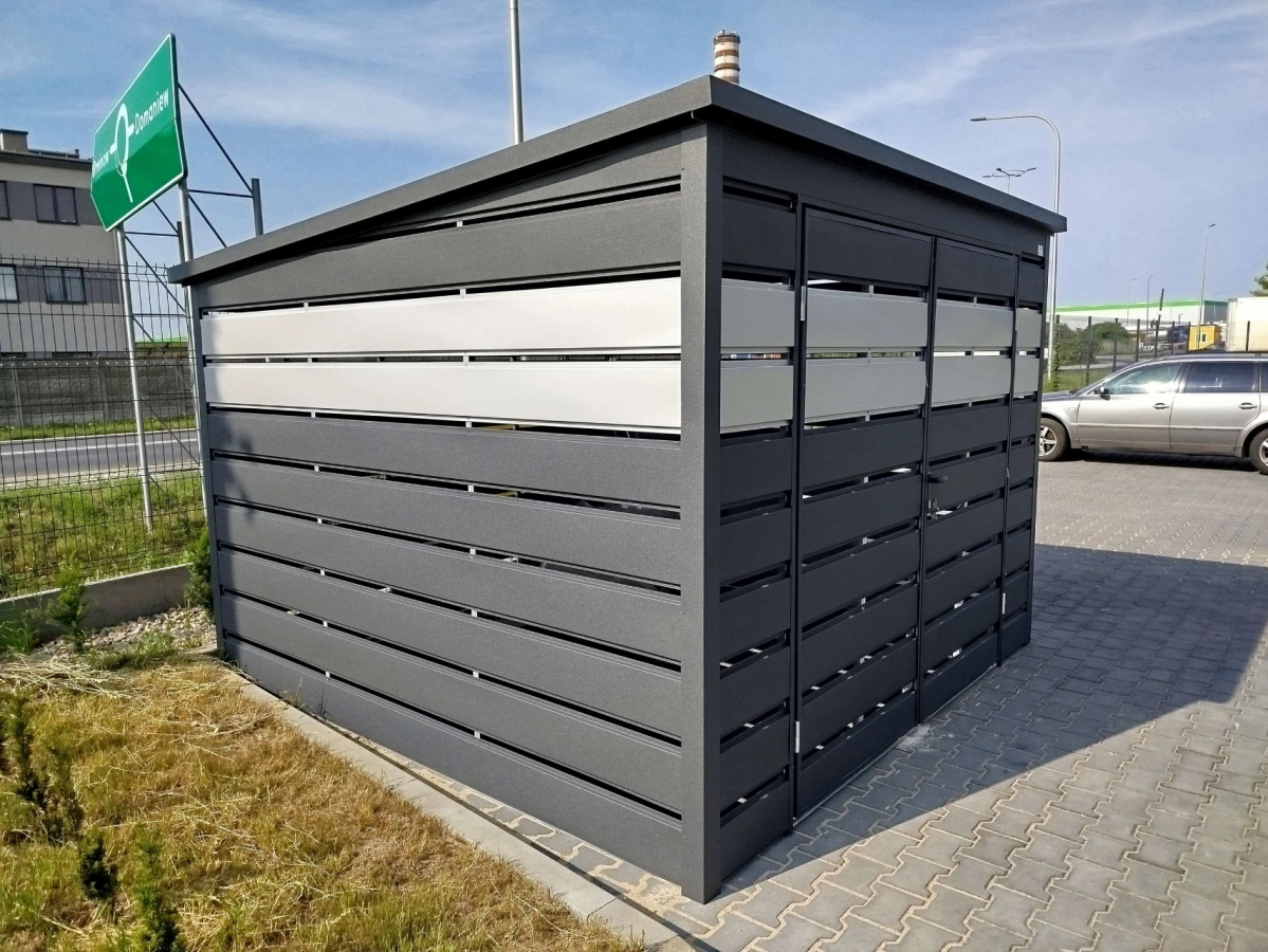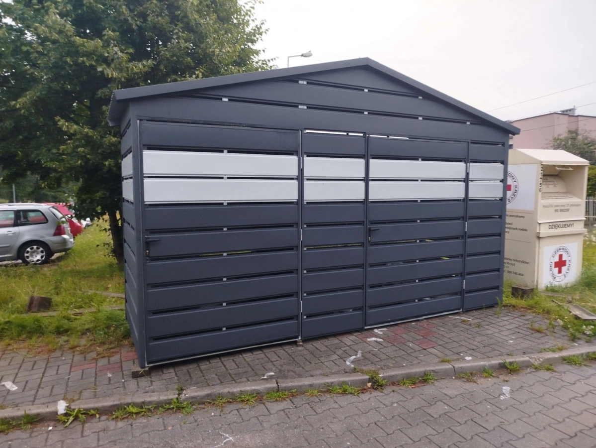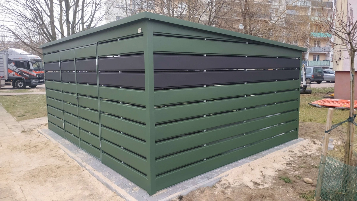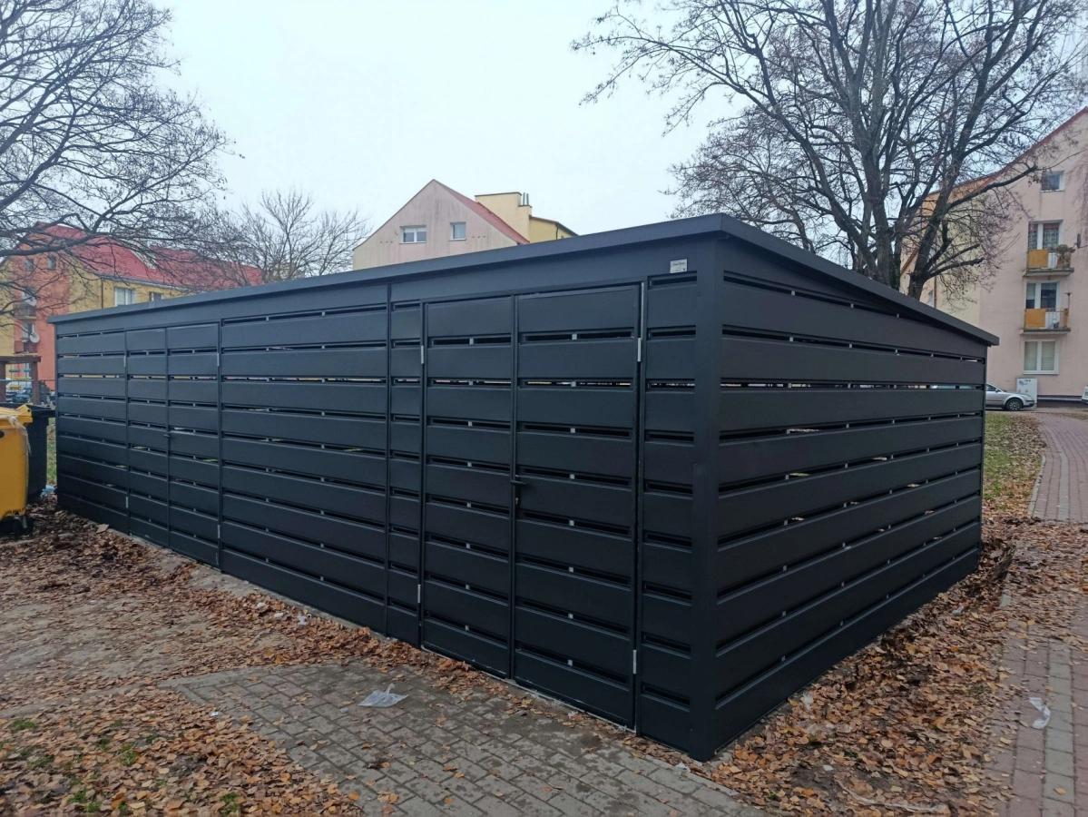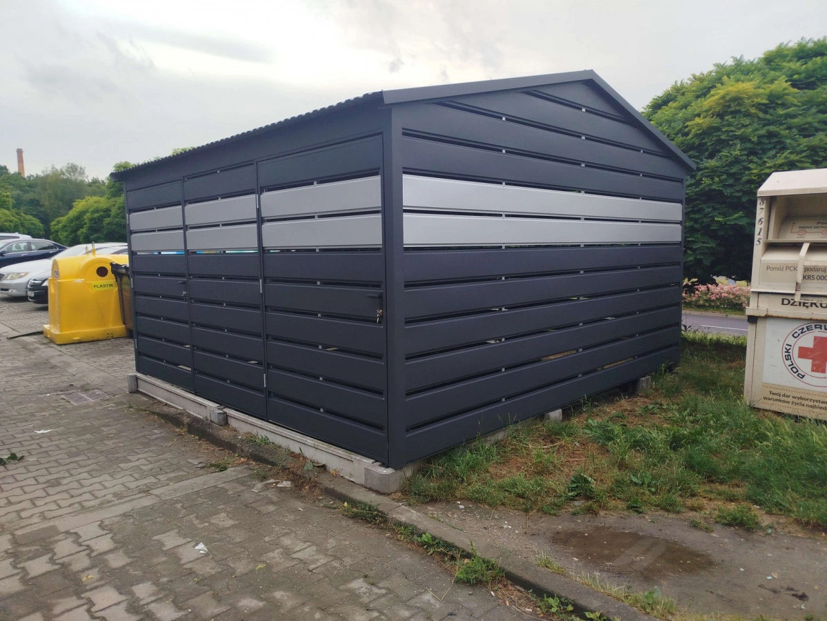 <p>Wiata śmietnikowa o wymiarach <strong>3m x 3m</strong> naszej produkcji to nowoczesny i estetyczny sposób na przechowywanie koszy na śmieci. </p> <ul> <li>Wymiary są odpowiednio dobrane do wielkości pojemników 240 l lub 1100 l, zapewniając porządek we wnętrzu. </li> <li>Szeroka brama (standardowo 2m, ale możliwe są również inne wymiary) pozwala na swobodne wyciąganie i wkładanie koszy na śmieci do środka.</li> <li>Jednospadowy dach (ze spadkiem ku tyłowi) ułatwia usuwanie śniegu i odprowadzanie deszczu.</li> <li>Mocna konstrukcja jest odporna na warunki atmosferyczne i trwała. Profile zamknięte, ocynkowane ogniowo gwarantują jej sztywność, stabilność i elegancki wygląd. </li> </ul> <p>Wiata nadaje się do wykorzystania w charakterze schowka ogrodowego, pomieszczenia na rowery lub małego magazynku (jest zamykana na klucz). Można ją wykonać według Państwa specyfikacji i w wybranej indywidualnie kolorystyce, by jeszcze lepiej komponowała się z otoczeniem.</p>