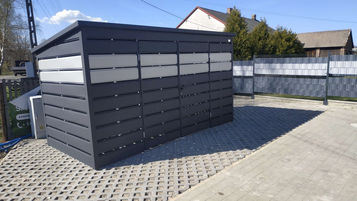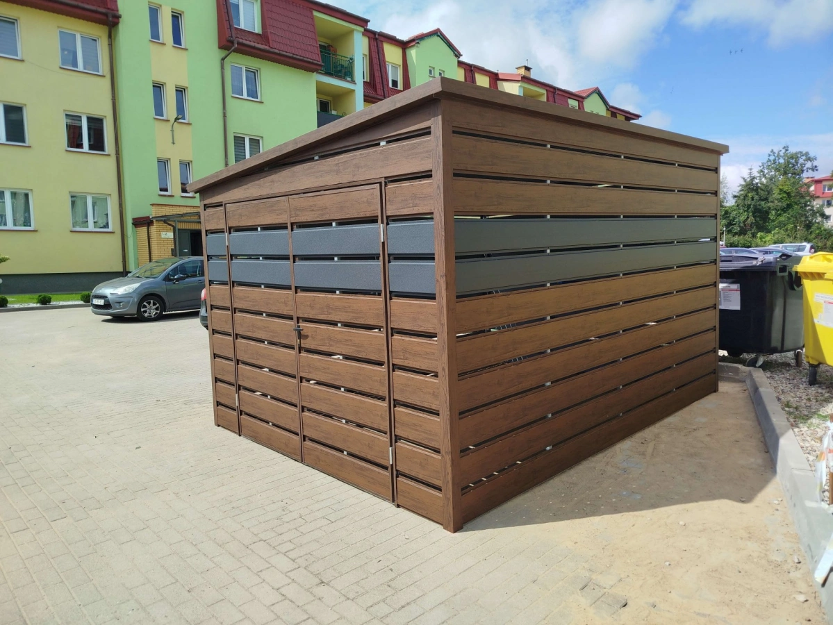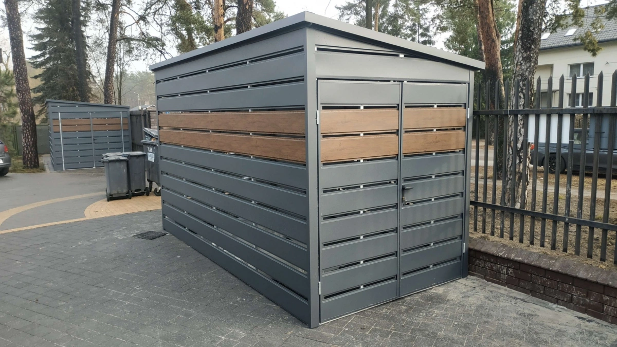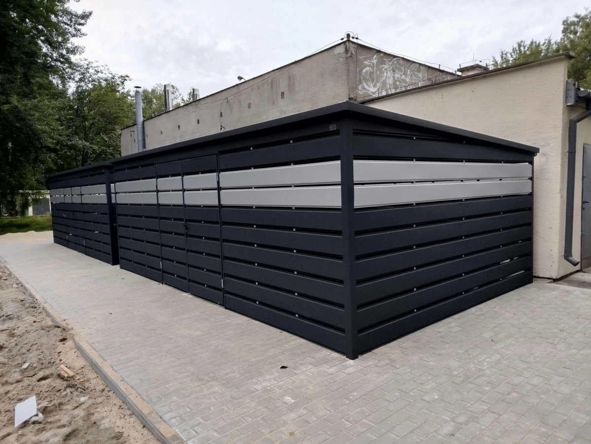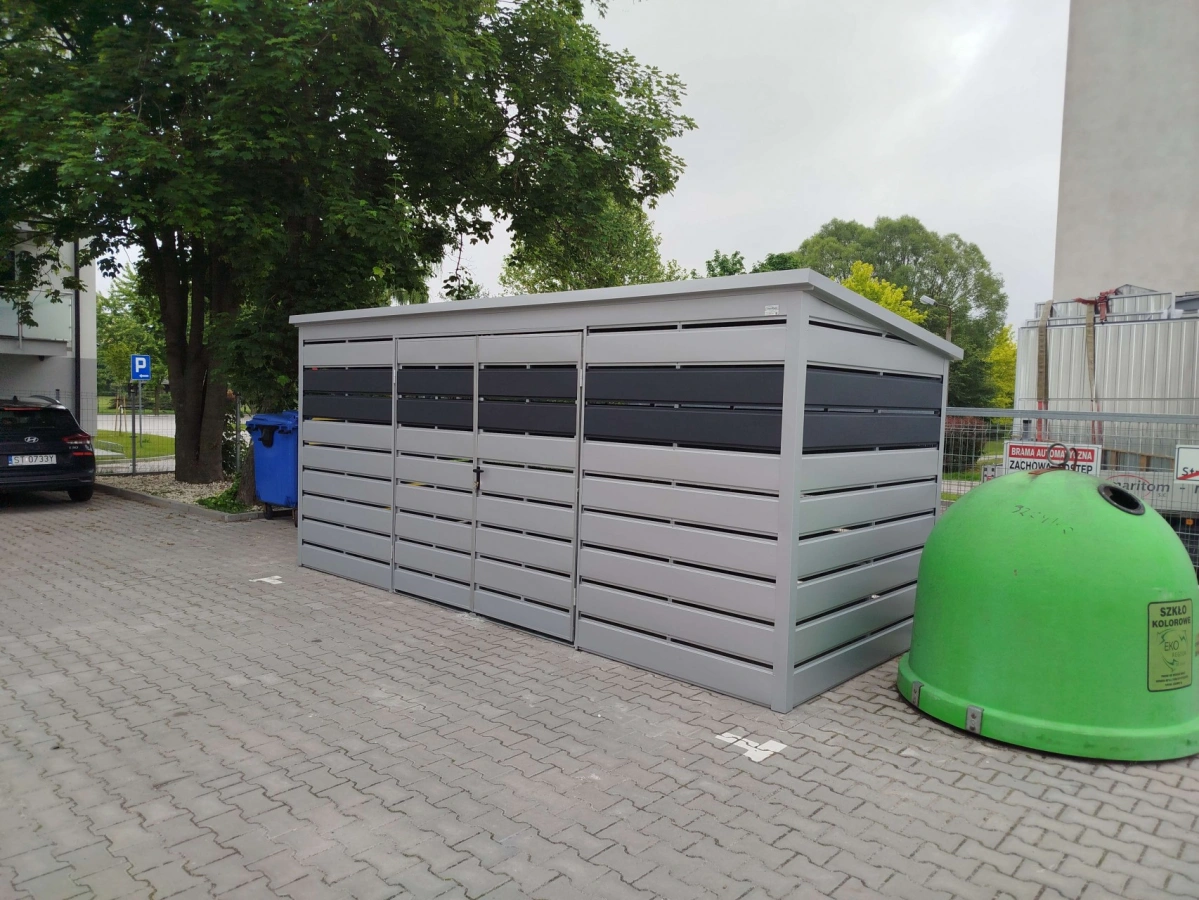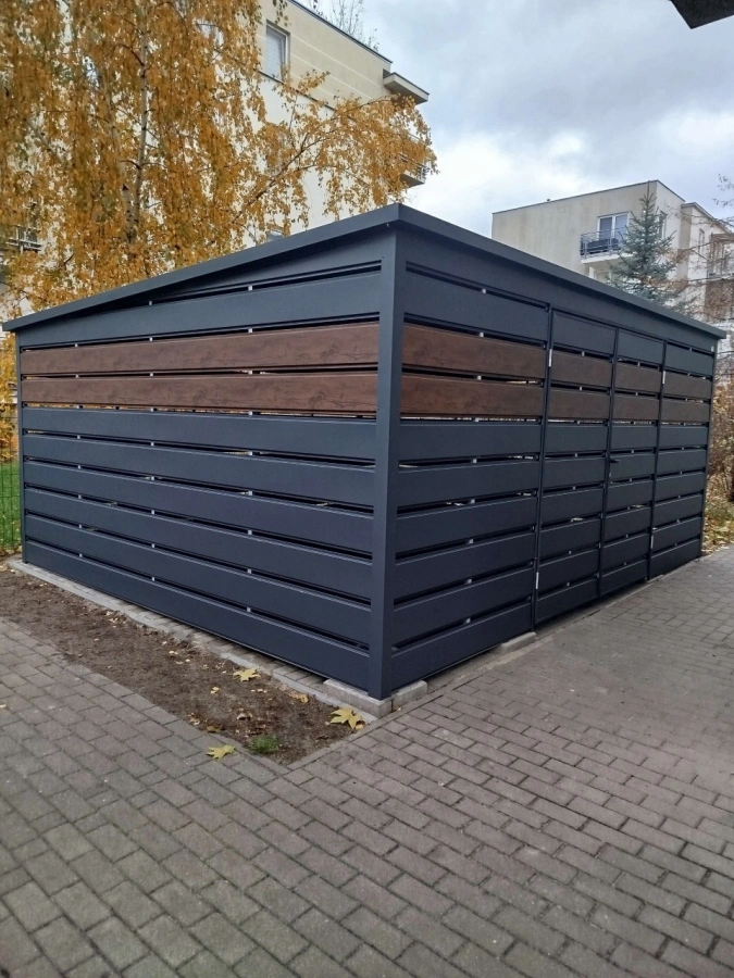 <p>Wiata śmietnikowa o wymiarach <strong>3m x 3m</strong> naszej produkcji to nowoczesny i estetyczny sposób na przechowywanie koszy na śmieci. </p> <ul> <li>Wymiary są odpowiednio dobrane do wielkości pojemników 240 l lub 1100 l, zapewniając porządek we wnętrzu. </li> <li>Szeroka brama (standardowo 2m, ale możliwe są również inne wymiary) pozwala na swobodne wyciąganie i wkładanie koszy na śmieci do środka.</li> <li>Jednospadowy dach (ze spadkiem ku tyłowi) ułatwia usuwanie śniegu i odprowadzanie deszczu.</li> <li>Mocna konstrukcja jest odporna na warunki atmosferyczne i trwała. Profile zamknięte, ocynkowane ogniowo gwarantują jej sztywność, stabilność i elegancki wygląd. </li> </ul> <p>Wiata nadaje się do wykorzystania w charakterze schowka ogrodowego, pomieszczenia na rowery lub małego magazynku (jest zamykana na klucz). Można ją wykonać według Państwa specyfikacji i w wybranej indywidualnie kolorystyce, by jeszcze lepiej komponowała się z otoczeniem.</p>