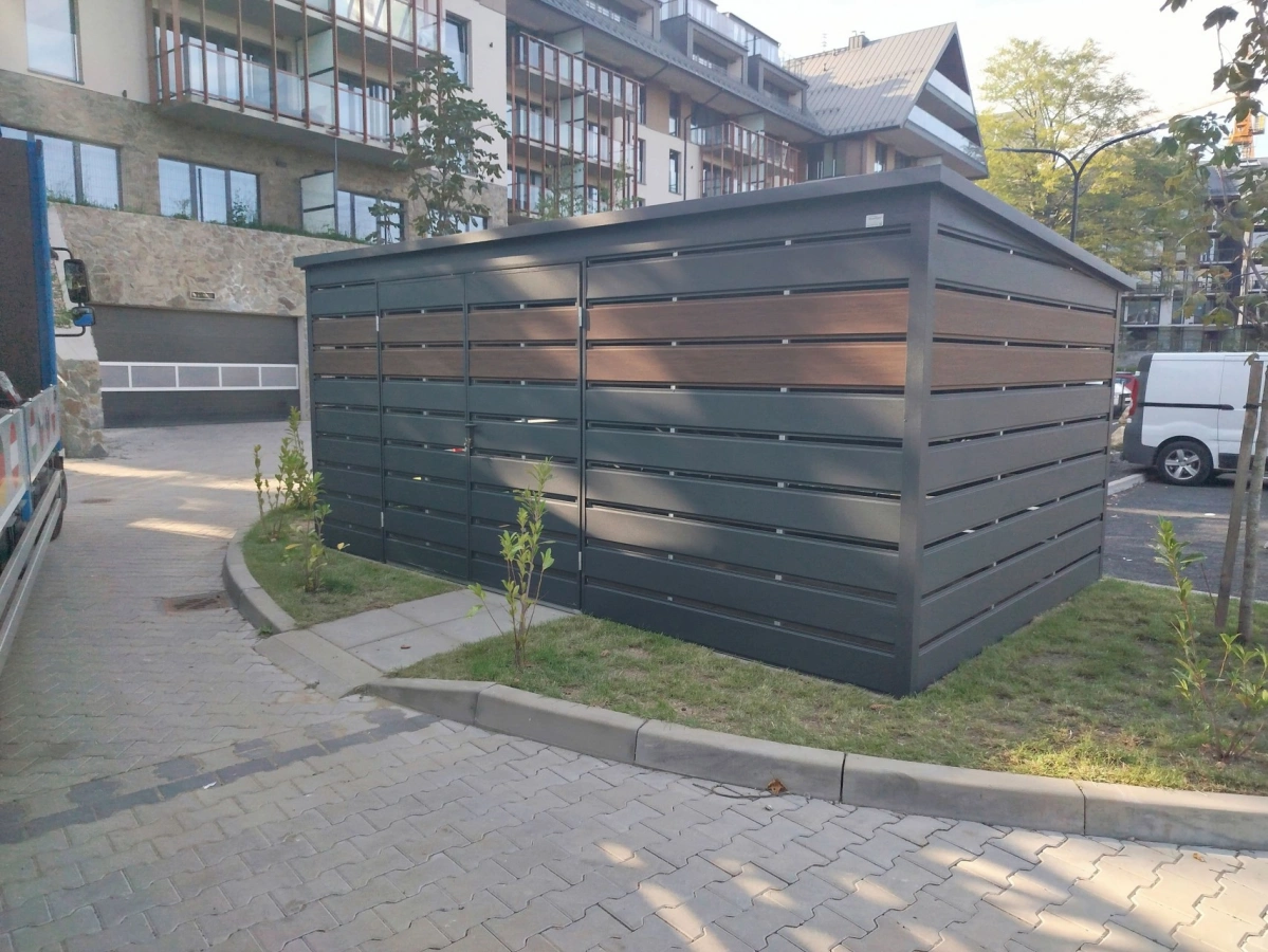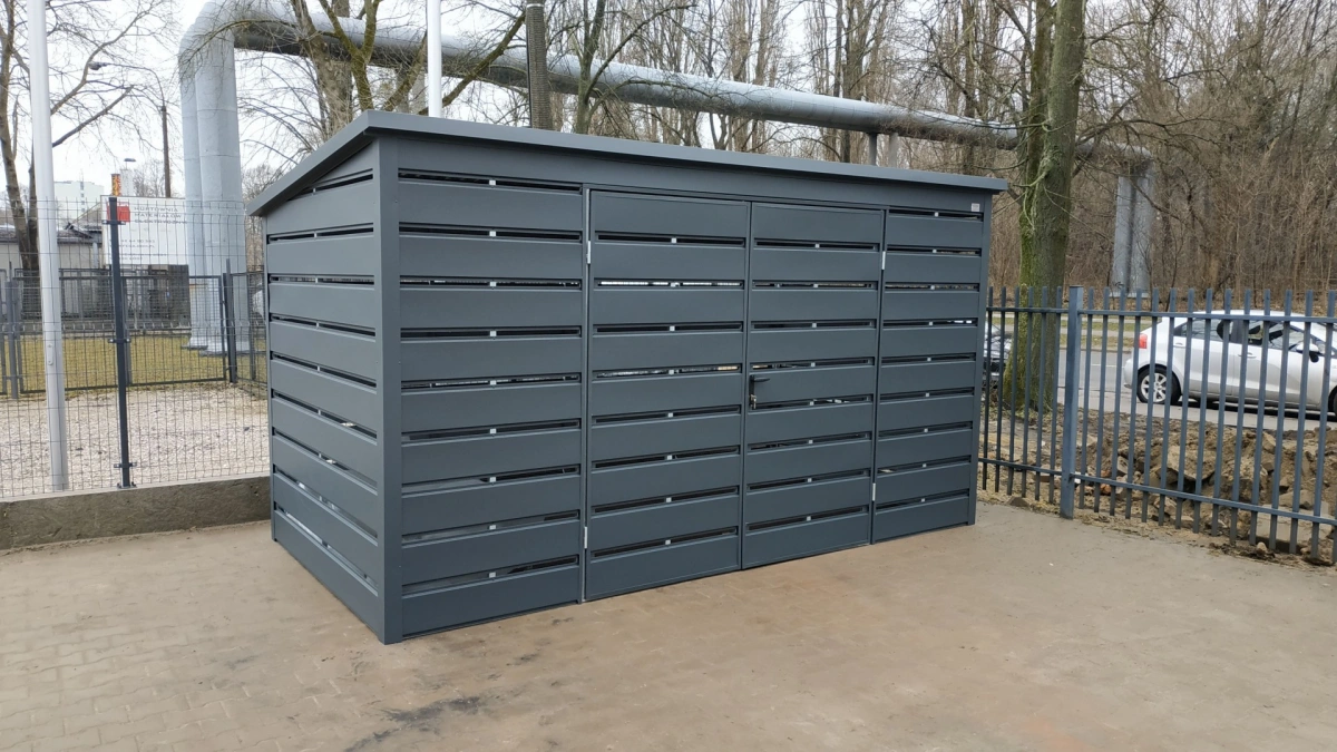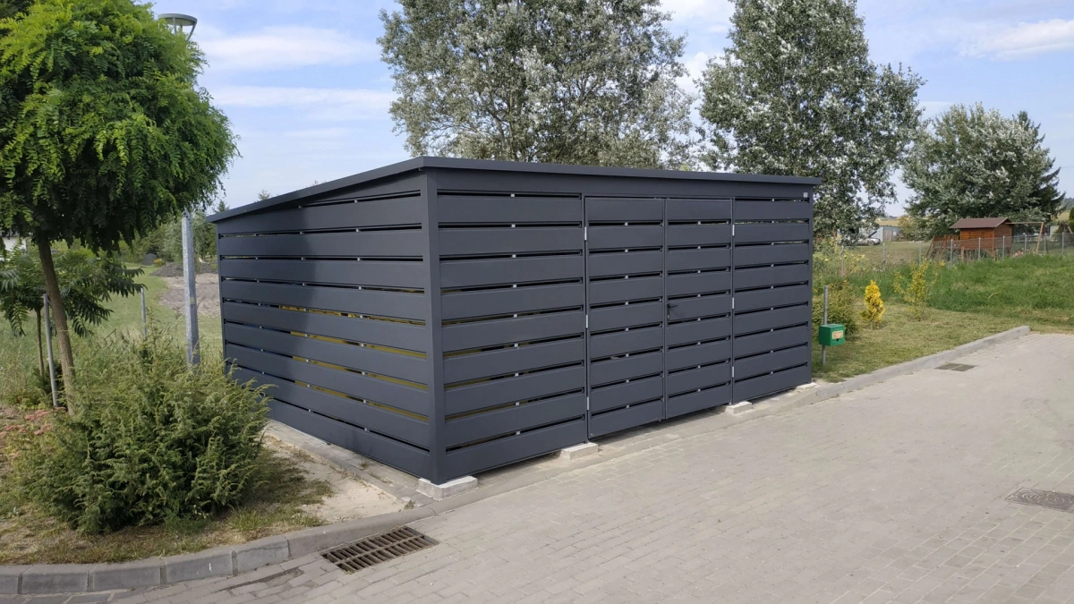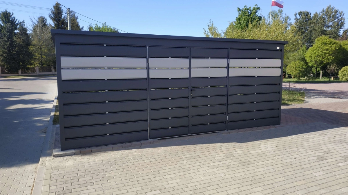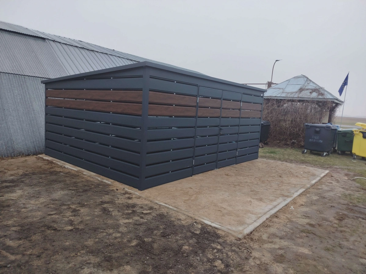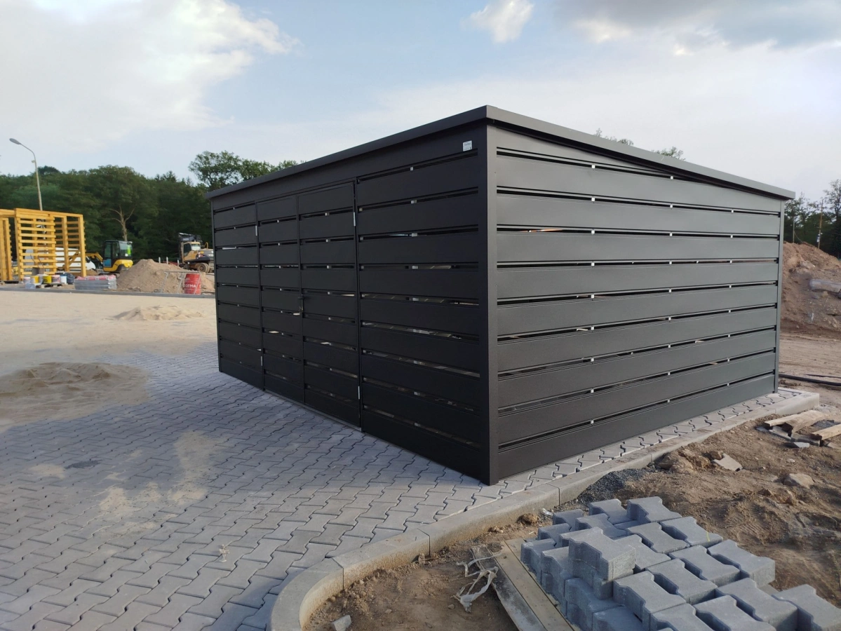 <p>Wiata śmietnikowa o wymiarach <strong>3m x 3m</strong> naszej produkcji to nowoczesny i estetyczny sposób na przechowywanie koszy na śmieci. </p> <ul> <li>Wymiary są odpowiednio dobrane do wielkości pojemników 240 l lub 1100 l, zapewniając porządek we wnętrzu. </li> <li>Szeroka brama (standardowo 2m, ale możliwe są również inne wymiary) pozwala na swobodne wyciąganie i wkładanie koszy na śmieci do środka.</li> <li>Jednospadowy dach (ze spadkiem ku tyłowi) ułatwia usuwanie śniegu i odprowadzanie deszczu.</li> <li>Mocna konstrukcja jest odporna na warunki atmosferyczne i trwała. Profile zamknięte, ocynkowane ogniowo gwarantują jej sztywność, stabilność i elegancki wygląd. </li> </ul> <p>Wiata nadaje się do wykorzystania w charakterze schowka ogrodowego, pomieszczenia na rowery lub małego magazynku (jest zamykana na klucz). Można ją wykonać według Państwa specyfikacji i w wybranej indywidualnie kolorystyce, by jeszcze lepiej komponowała się z otoczeniem.</p>