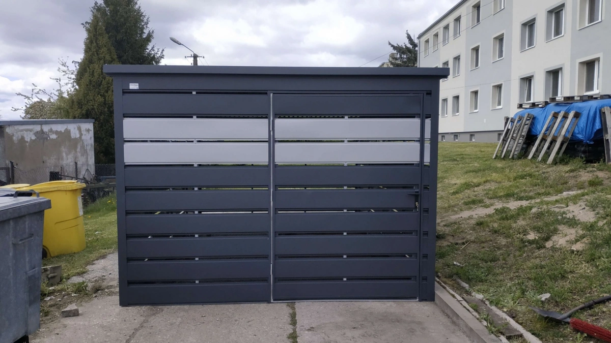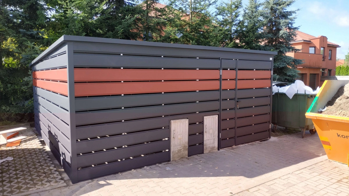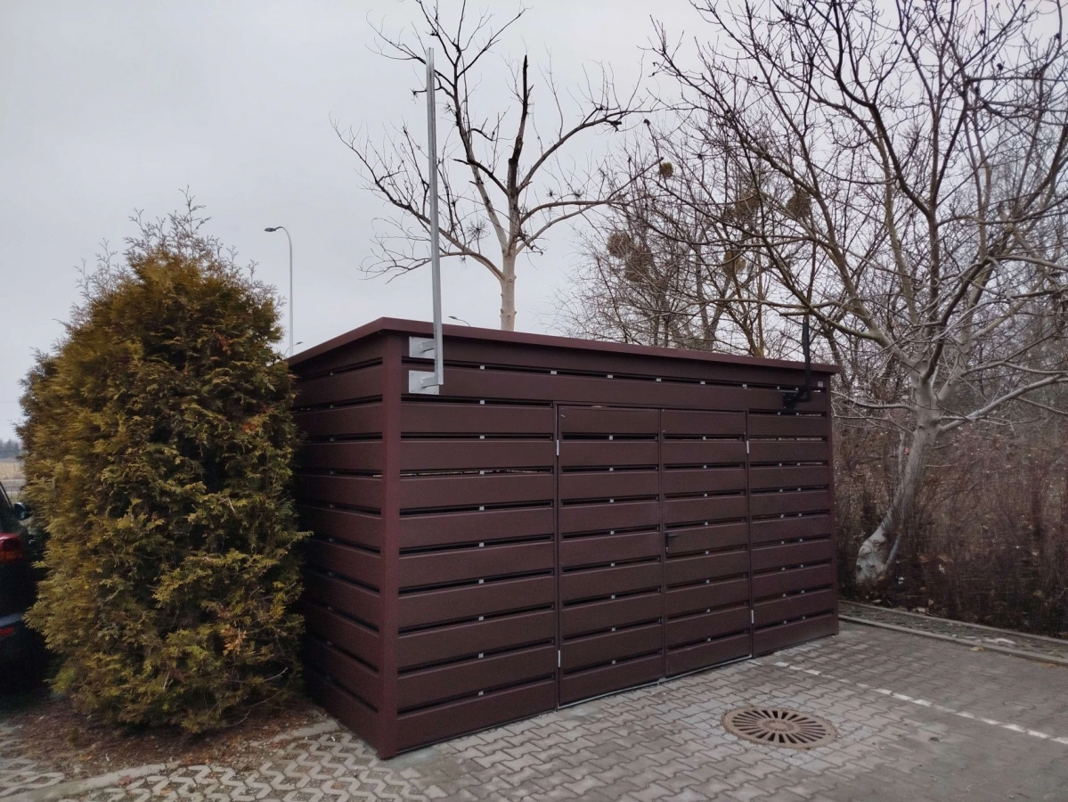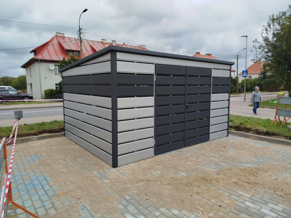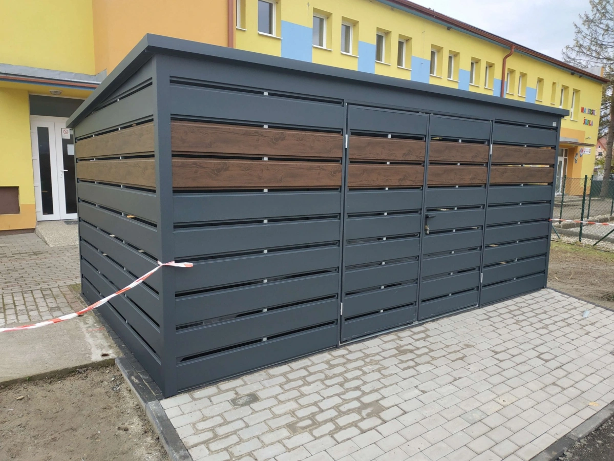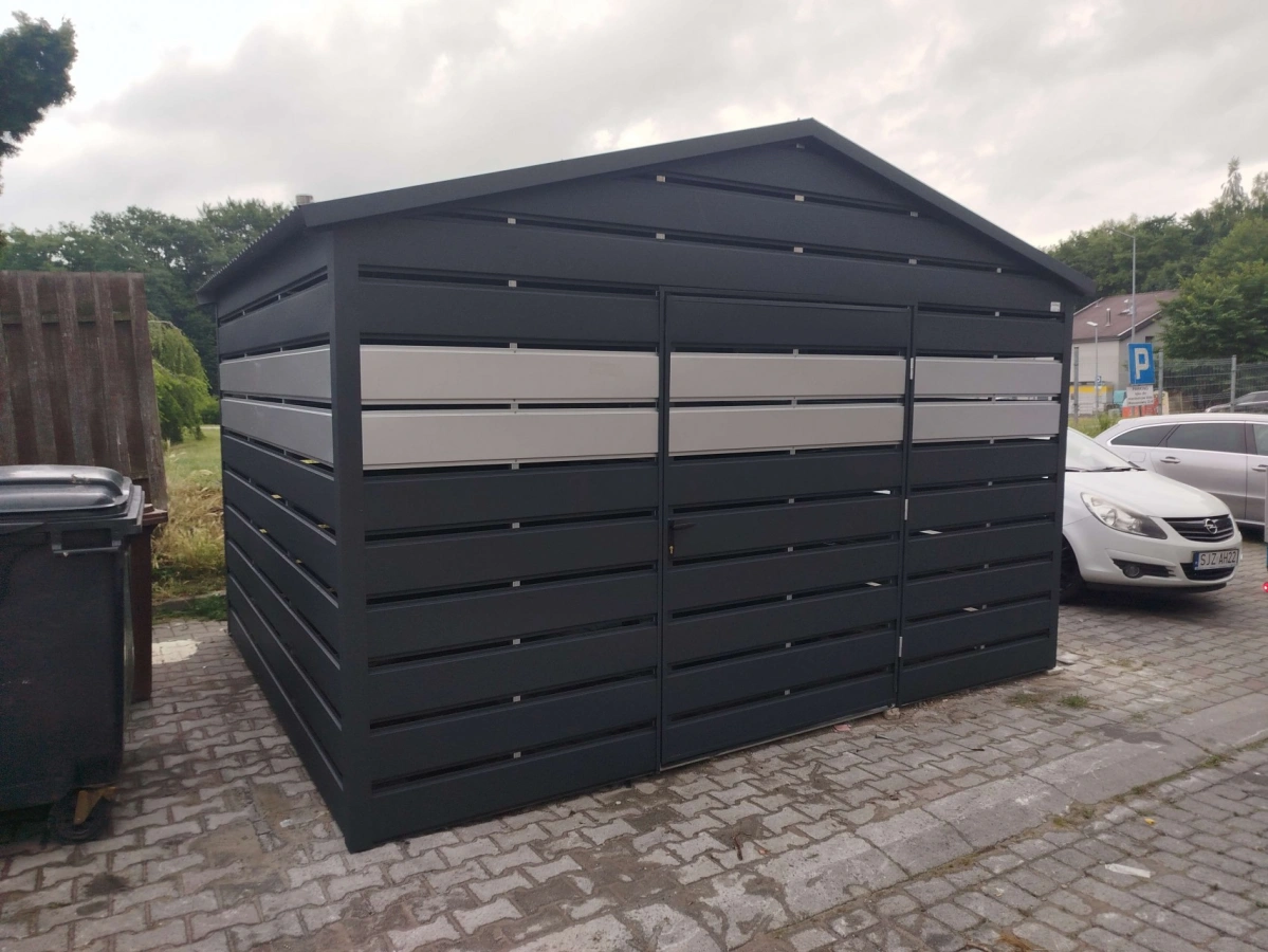 <p>Wiata śmietnikowa o wymiarach <strong>3m x 3m</strong> naszej produkcji to nowoczesny i estetyczny sposób na przechowywanie koszy na śmieci. </p> <ul> <li>Wymiary są odpowiednio dobrane do wielkości pojemników 240 l lub 1100 l, zapewniając porządek we wnętrzu. </li> <li>Szeroka brama (standardowo 2m, ale możliwe są również inne wymiary) pozwala na swobodne wyciąganie i wkładanie koszy na śmieci do środka.</li> <li>Jednospadowy dach (ze spadkiem ku tyłowi) ułatwia usuwanie śniegu i odprowadzanie deszczu.</li> <li>Mocna konstrukcja jest odporna na warunki atmosferyczne i trwała. Profile zamknięte, ocynkowane ogniowo gwarantują jej sztywność, stabilność i elegancki wygląd. </li> </ul> <p>Wiata nadaje się do wykorzystania w charakterze schowka ogrodowego, pomieszczenia na rowery lub małego magazynku (jest zamykana na klucz). Można ją wykonać według Państwa specyfikacji i w wybranej indywidualnie kolorystyce, by jeszcze lepiej komponowała się z otoczeniem.</p>