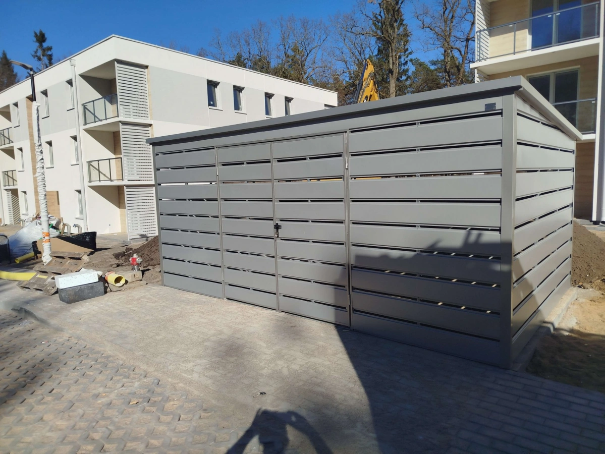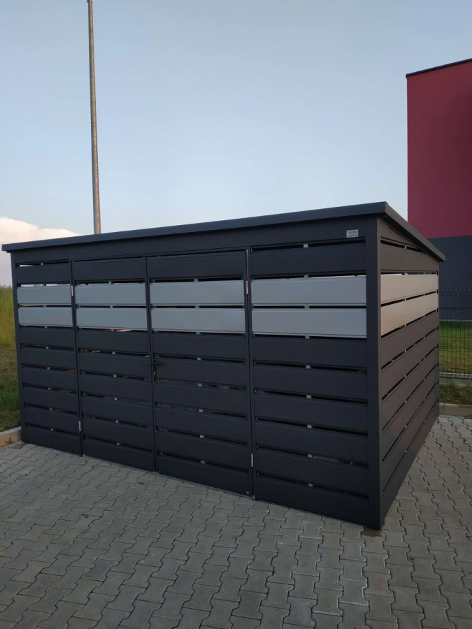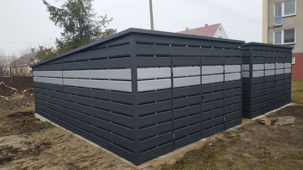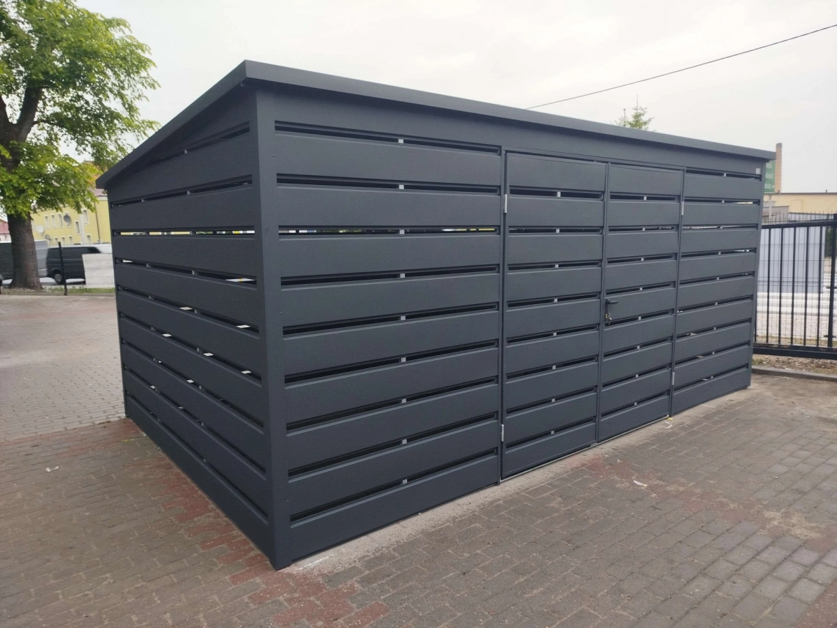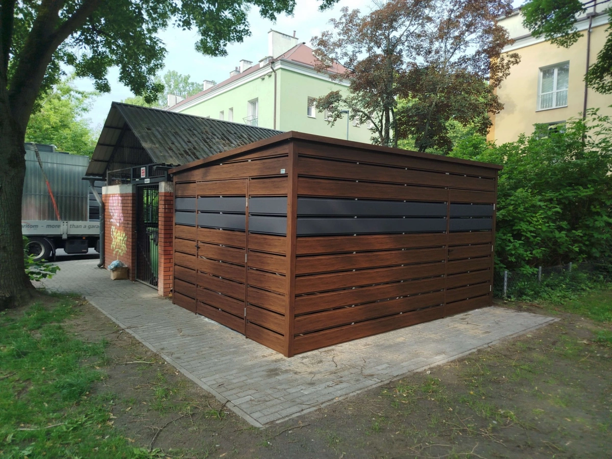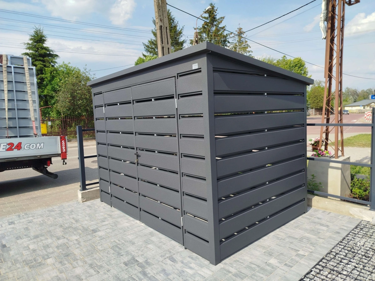<p>Wiata śmietnikowa o wymiarach <strong>3m x 3m</strong> naszej produkcji to nowoczesny i estetyczny sposób na przechowywanie koszy na śmieci. </p> <ul> <li>Wymiary są odpowiednio dobrane do wielkości pojemników 240 l lub 1100 l, zapewniając porządek we wnętrzu. </li> <li>Szeroka brama (standardowo 2m, ale możliwe są również inne wymiary) pozwala na swobodne wyciąganie i wkładanie koszy na śmieci do środka.</li> <li>Jednospadowy dach (ze spadkiem ku tyłowi) ułatwia usuwanie śniegu i odprowadzanie deszczu.</li> <li>Mocna konstrukcja jest odporna na warunki atmosferyczne i trwała. Profile zamknięte, ocynkowane ogniowo gwarantują jej sztywność, stabilność i elegancki wygląd. </li> </ul> <p>Wiata nadaje się do wykorzystania w charakterze schowka ogrodowego, pomieszczenia na rowery lub małego magazynku (jest zamykana na klucz). Można ją wykonać według Państwa specyfikacji i w wybranej indywidualnie kolorystyce, by jeszcze lepiej komponowała się z otoczeniem.</p>