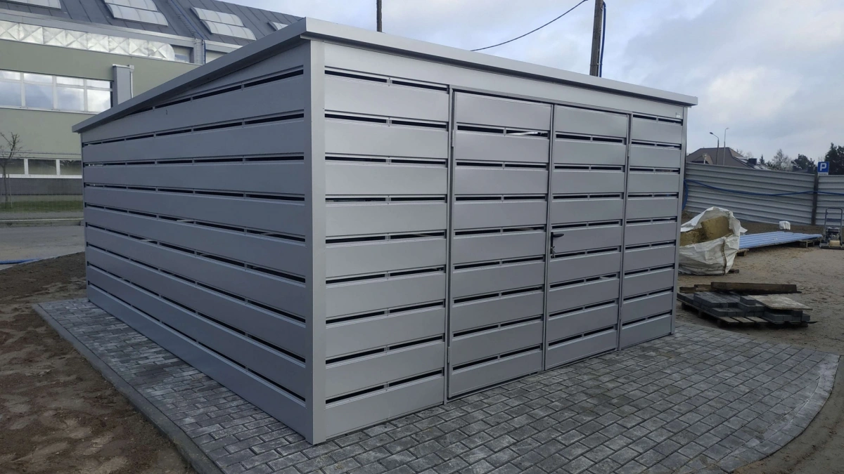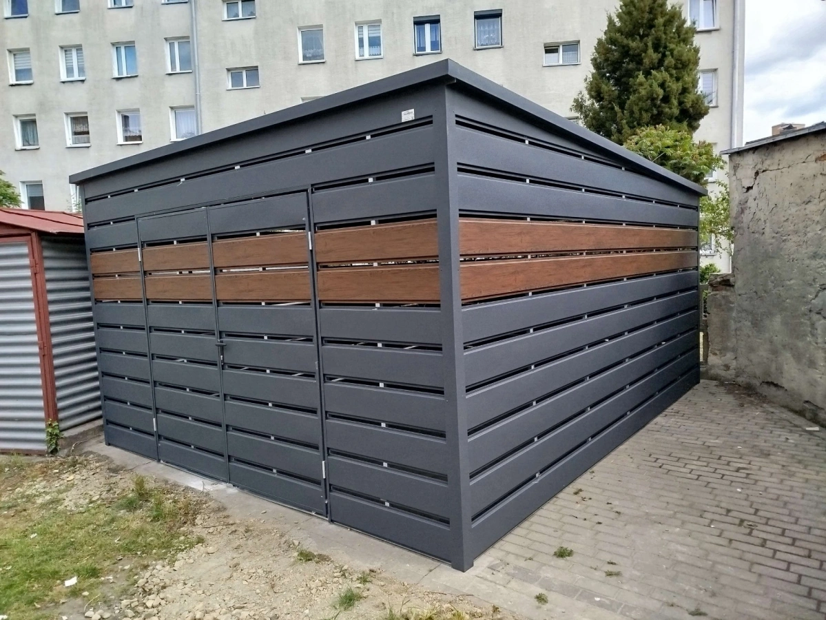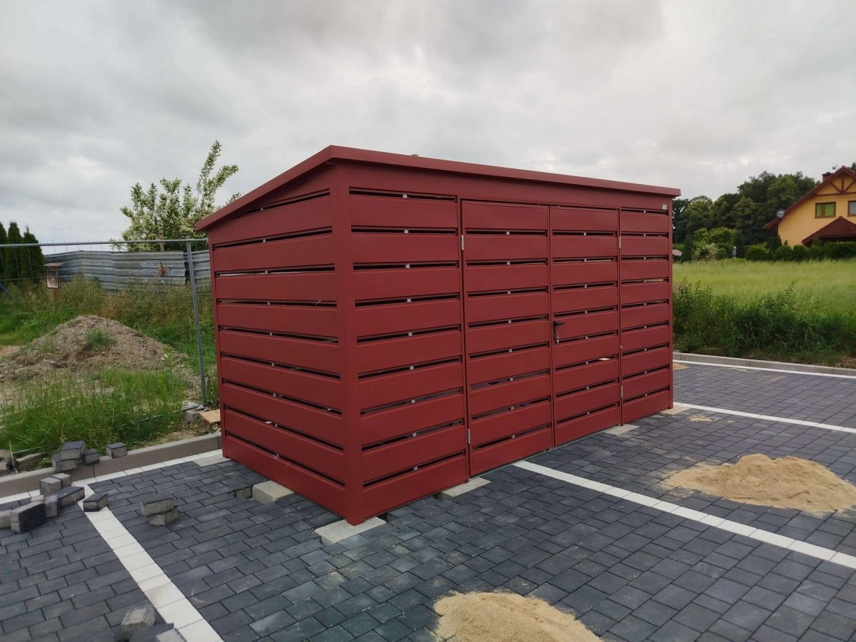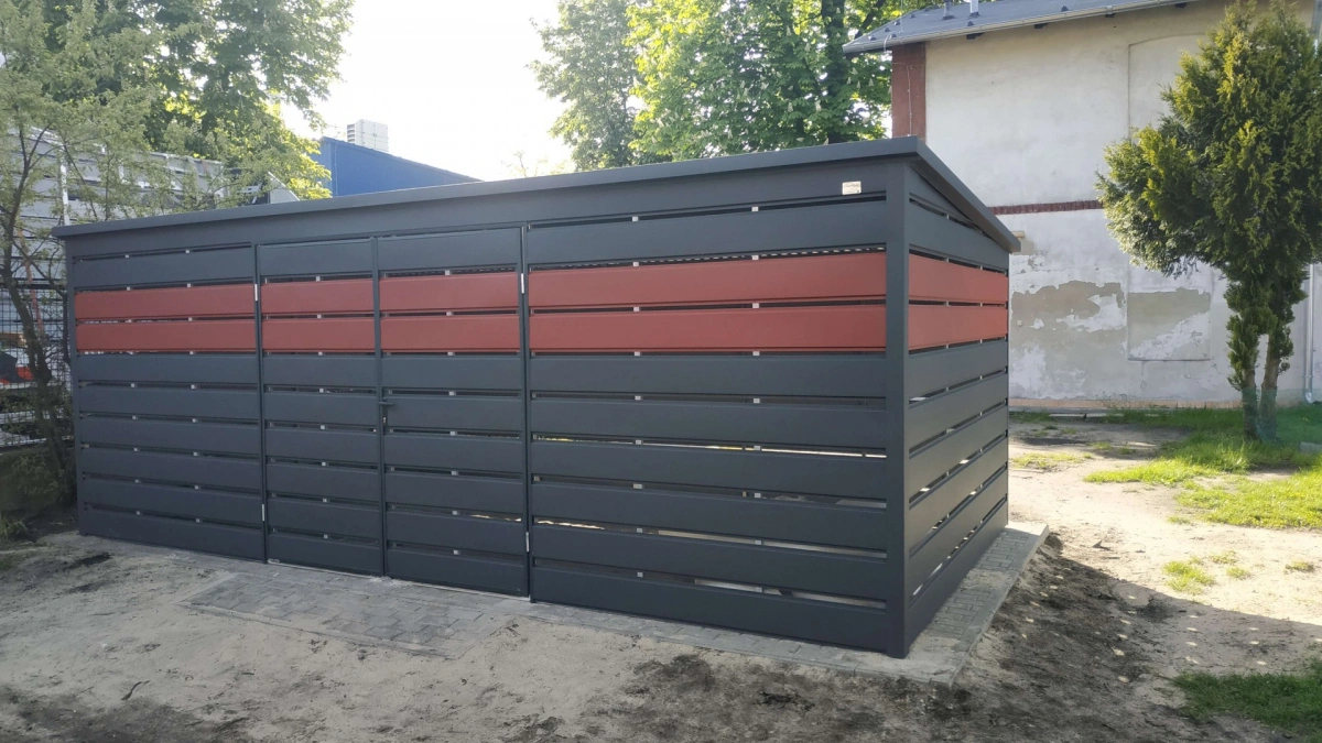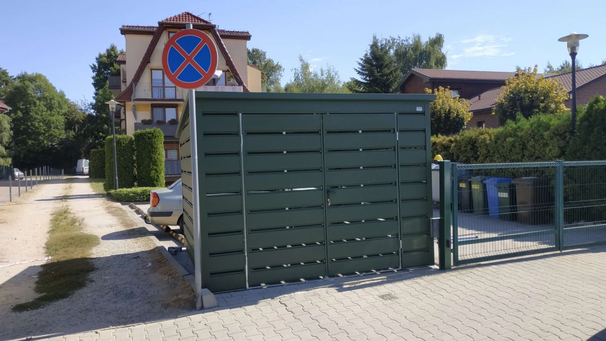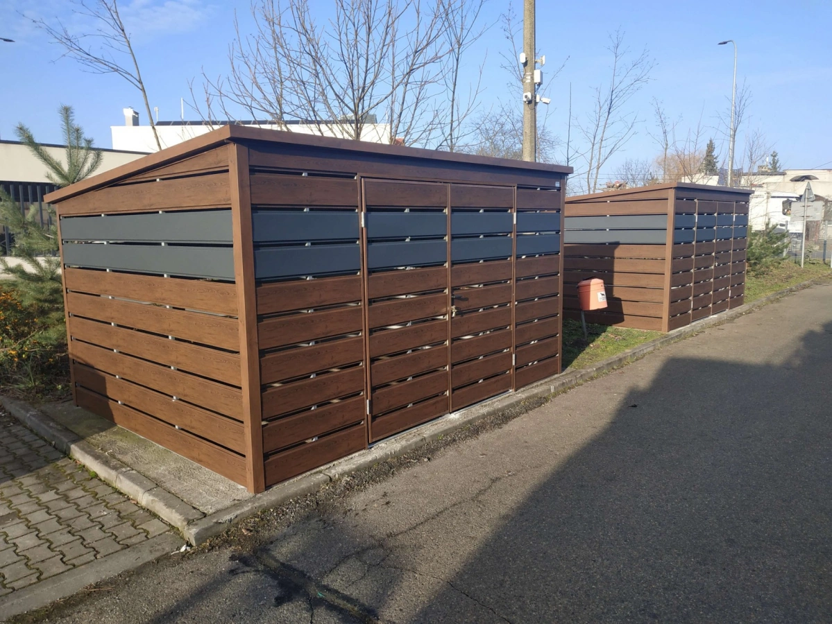 <p>Wiata śmietnikowa o wymiarach <strong>3m x 3m</strong> naszej produkcji to nowoczesny i estetyczny sposób na przechowywanie koszy na śmieci. </p> <ul> <li>Wymiary są odpowiednio dobrane do wielkości pojemników 240 l lub 1100 l, zapewniając porządek we wnętrzu. </li> <li>Szeroka brama (standardowo 2m, ale możliwe są również inne wymiary) pozwala na swobodne wyciąganie i wkładanie koszy na śmieci do środka.</li> <li>Jednospadowy dach (ze spadkiem ku tyłowi) ułatwia usuwanie śniegu i odprowadzanie deszczu.</li> <li>Mocna konstrukcja jest odporna na warunki atmosferyczne i trwała. Profile zamknięte, ocynkowane ogniowo gwarantują jej sztywność, stabilność i elegancki wygląd. </li> </ul> <p>Wiata nadaje się do wykorzystania w charakterze schowka ogrodowego, pomieszczenia na rowery lub małego magazynku (jest zamykana na klucz). Można ją wykonać według Państwa specyfikacji i w wybranej indywidualnie kolorystyce, by jeszcze lepiej komponowała się z otoczeniem.</p>