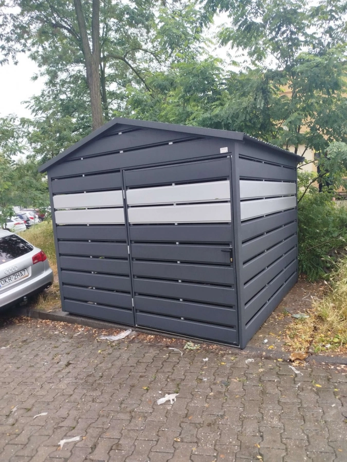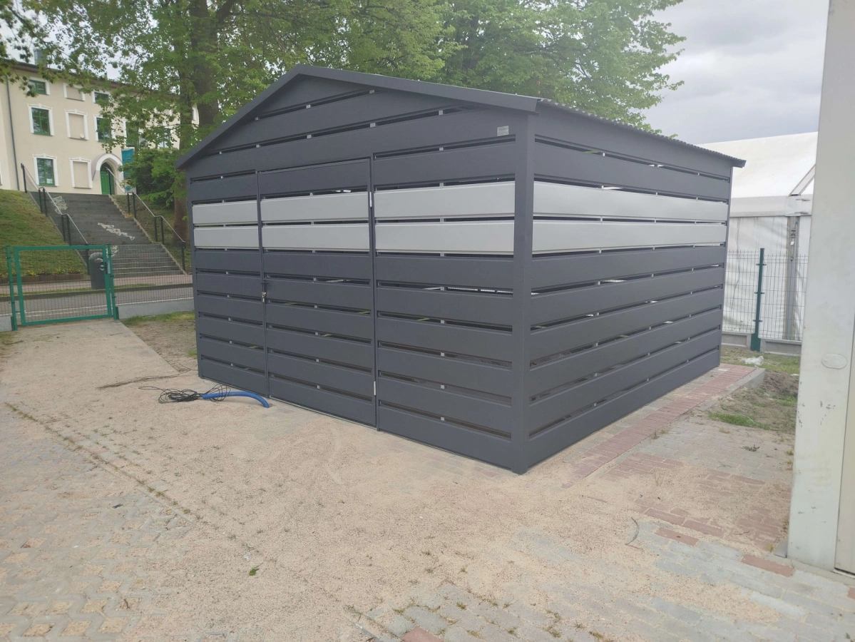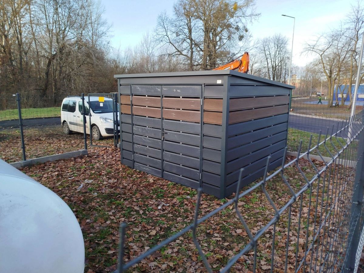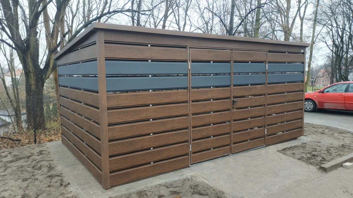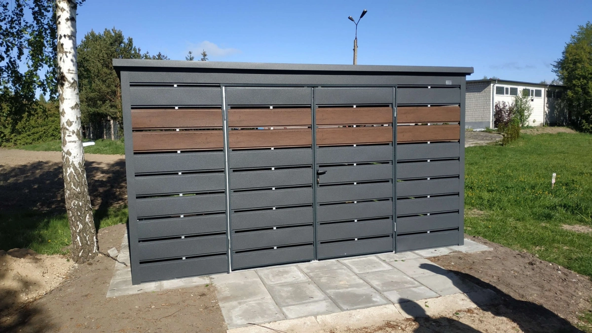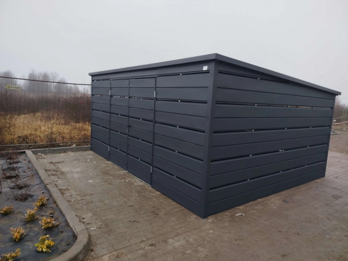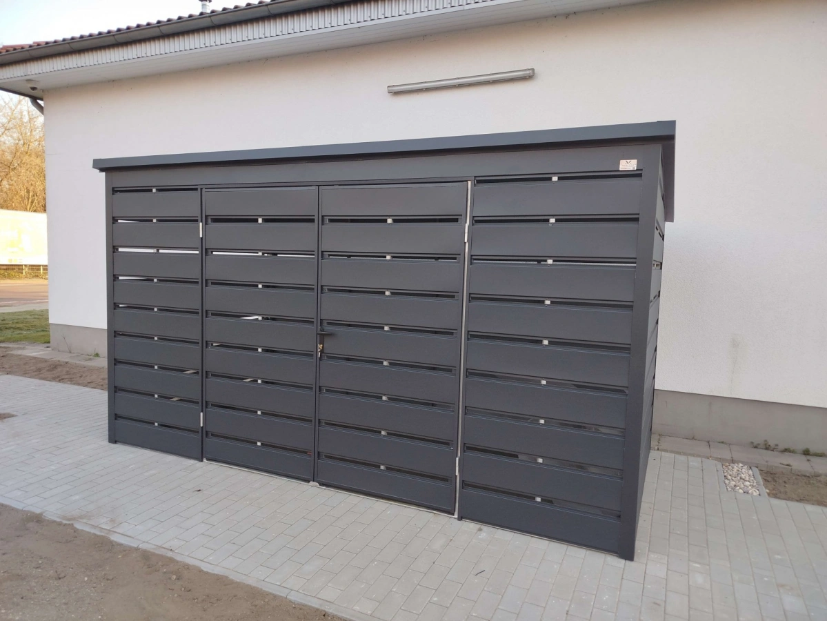 <p>Wiata śmietnikowa o wymiarach <strong>3m x 3m</strong> naszej produkcji to nowoczesny i estetyczny sposób na przechowywanie koszy na śmieci. </p> <ul> <li>Wymiary są odpowiednio dobrane do wielkości pojemników 240 l lub 1100 l, zapewniając porządek we wnętrzu. </li> <li>Szeroka brama (standardowo 2m, ale możliwe są również inne wymiary) pozwala na swobodne wyciąganie i wkładanie koszy na śmieci do środka.</li> <li>Jednospadowy dach (ze spadkiem ku tyłowi) ułatwia usuwanie śniegu i odprowadzanie deszczu.</li> <li>Mocna konstrukcja jest odporna na warunki atmosferyczne i trwała. Profile zamknięte, ocynkowane ogniowo gwarantują jej sztywność, stabilność i elegancki wygląd. </li> </ul> <p>Wiata nadaje się do wykorzystania w charakterze schowka ogrodowego, pomieszczenia na rowery lub małego magazynku (jest zamykana na klucz). Można ją wykonać według Państwa specyfikacji i w wybranej indywidualnie kolorystyce, by jeszcze lepiej komponowała się z otoczeniem.</p>