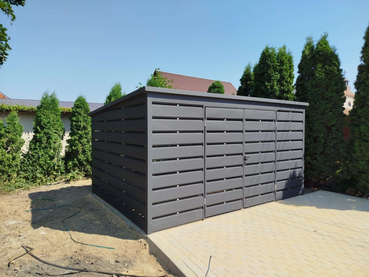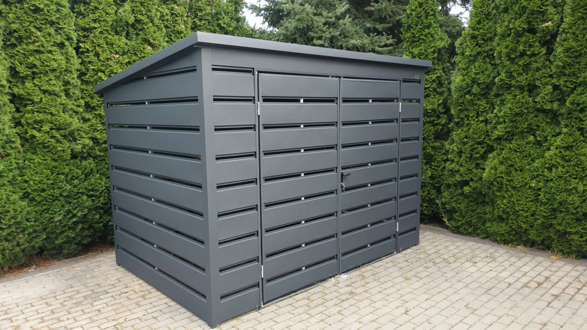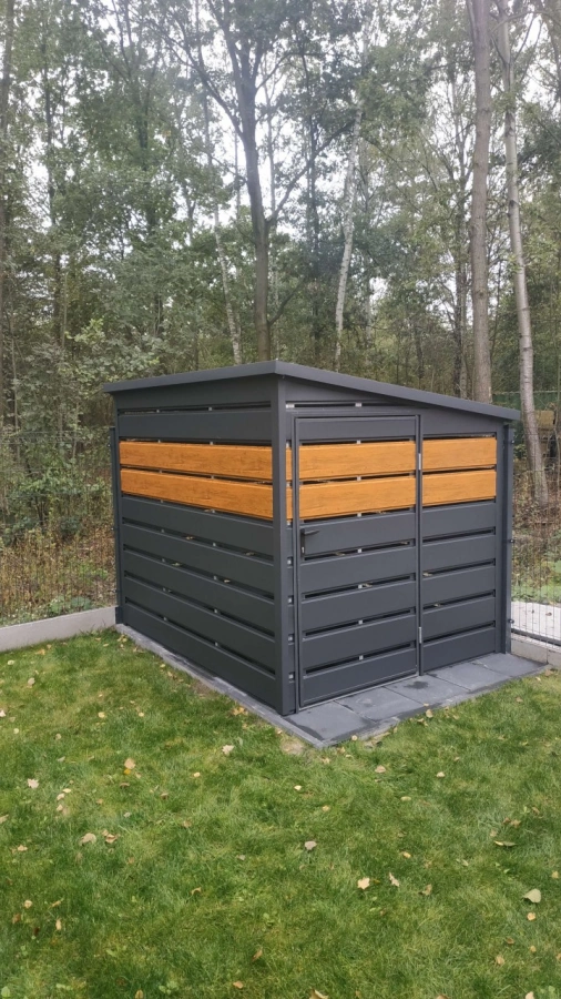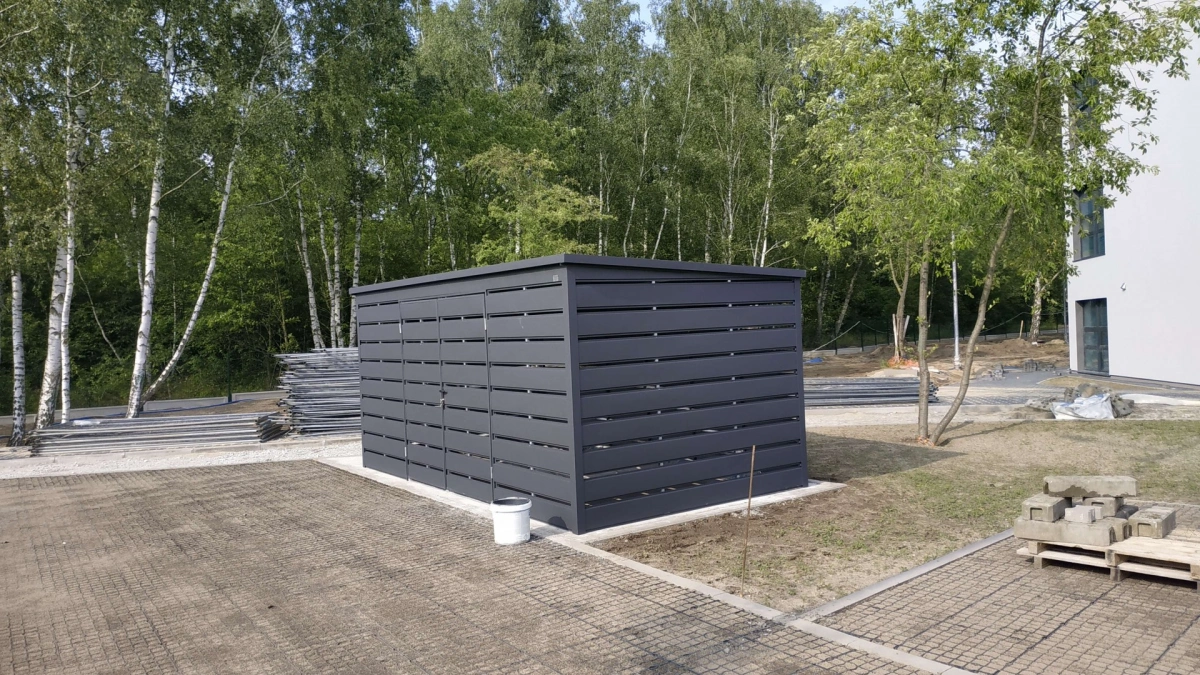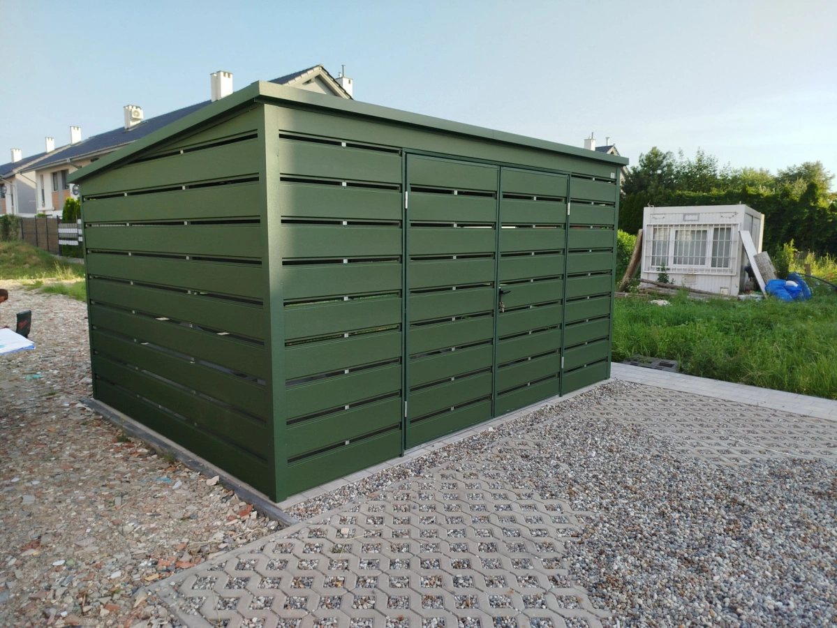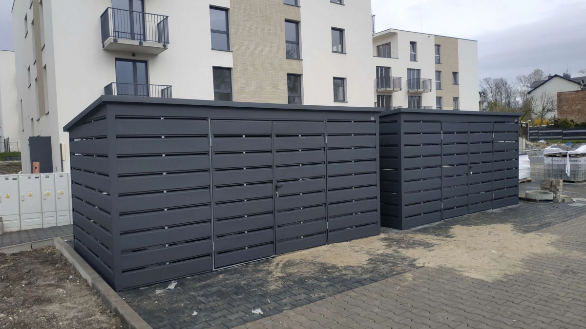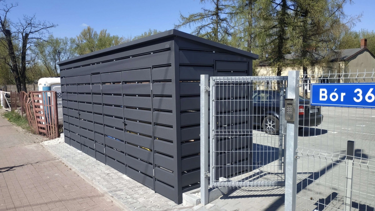 <p>Wiata śmietnikowa o wymiarach <strong>3m x 3m</strong> naszej produkcji to nowoczesny i estetyczny sposób na przechowywanie koszy na śmieci. </p> <ul> <li>Wymiary są odpowiednio dobrane do wielkości pojemników 240 l lub 1100 l, zapewniając porządek we wnętrzu. </li> <li>Szeroka brama (standardowo 2m, ale możliwe są również inne wymiary) pozwala na swobodne wyciąganie i wkładanie koszy na śmieci do środka.</li> <li>Jednospadowy dach (ze spadkiem ku tyłowi) ułatwia usuwanie śniegu i odprowadzanie deszczu.</li> <li>Mocna konstrukcja jest odporna na warunki atmosferyczne i trwała. Profile zamknięte, ocynkowane ogniowo gwarantują jej sztywność, stabilność i elegancki wygląd. </li> </ul> <p>Wiata nadaje się do wykorzystania w charakterze schowka ogrodowego, pomieszczenia na rowery lub małego magazynku (jest zamykana na klucz). Można ją wykonać według Państwa specyfikacji i w wybranej indywidualnie kolorystyce, by jeszcze lepiej komponowała się z otoczeniem.</p>