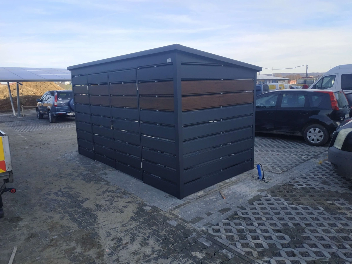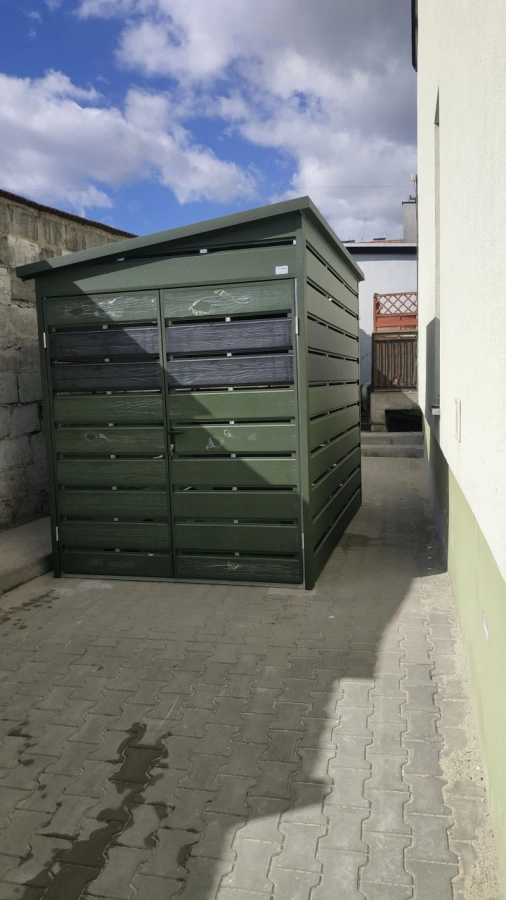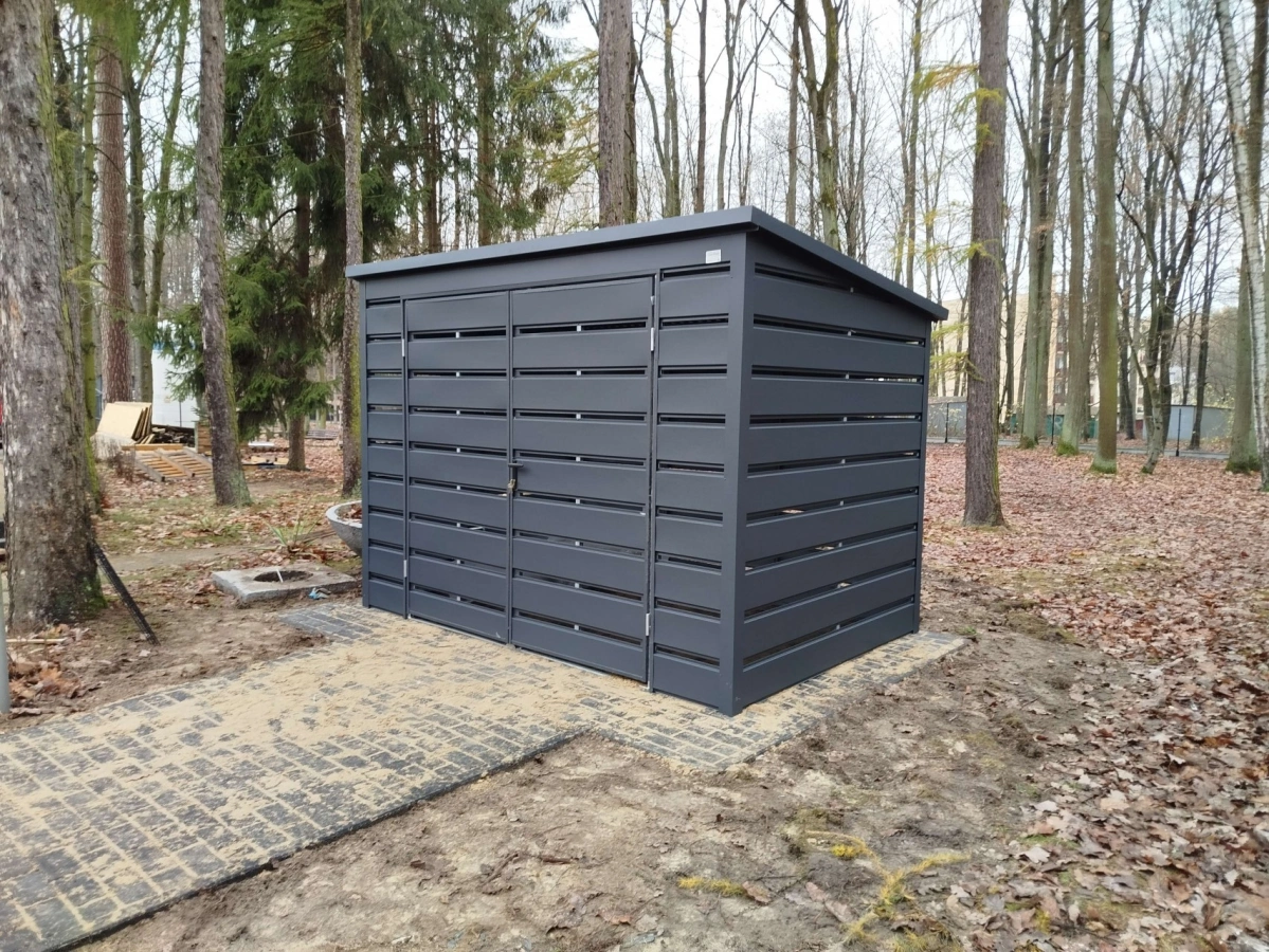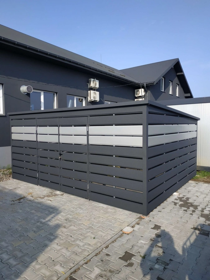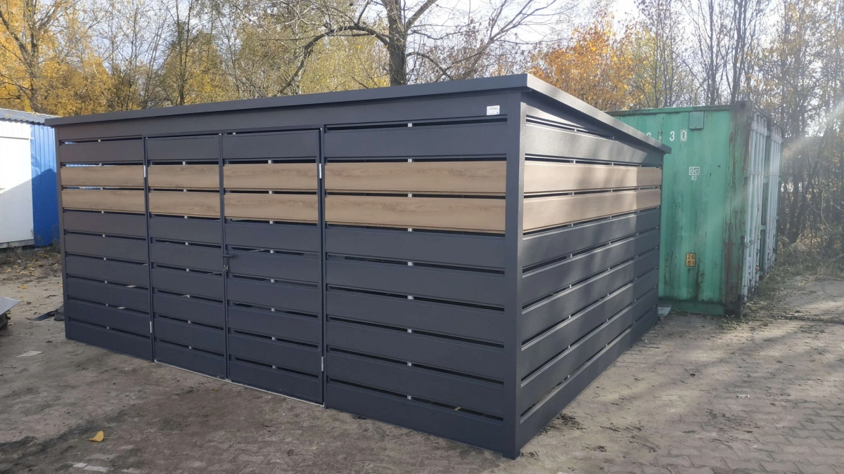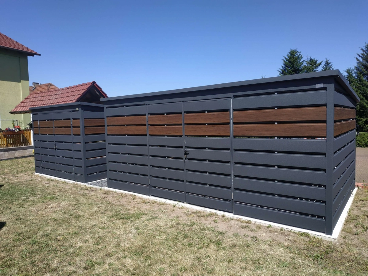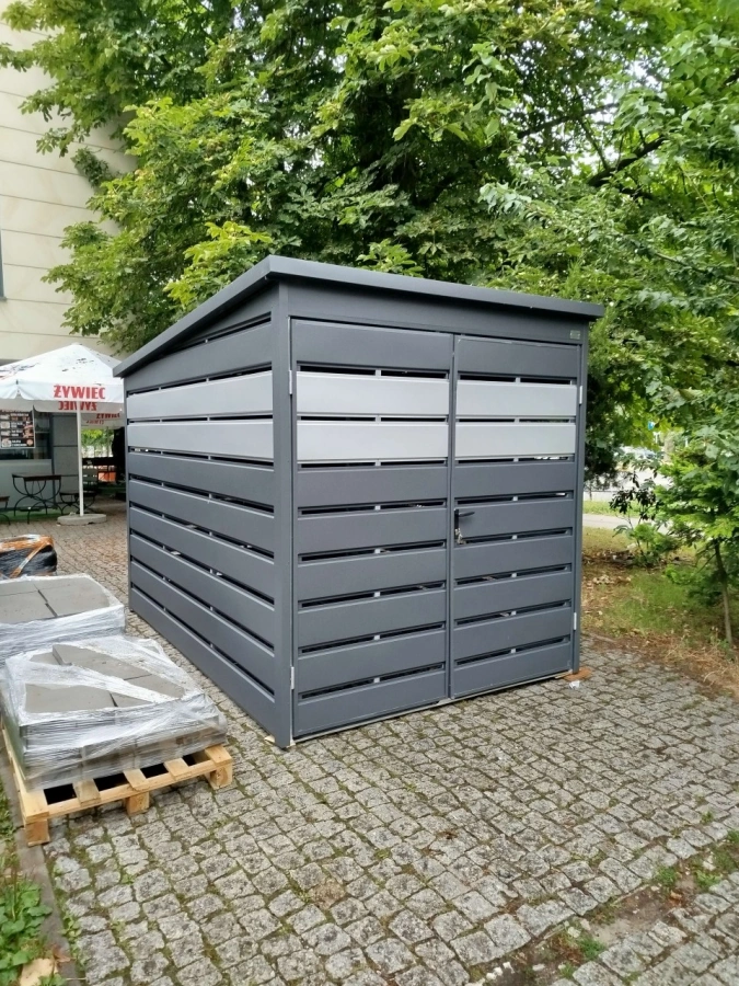 <p>Wiata śmietnikowa o wymiarach <strong>3m x 3m</strong> naszej produkcji to nowoczesny i estetyczny sposób na przechowywanie koszy na śmieci. </p> <ul> <li>Wymiary są odpowiednio dobrane do wielkości pojemników 240 l lub 1100 l, zapewniając porządek we wnętrzu. </li> <li>Szeroka brama (standardowo 2m, ale możliwe są również inne wymiary) pozwala na swobodne wyciąganie i wkładanie koszy na śmieci do środka.</li> <li>Jednospadowy dach (ze spadkiem ku tyłowi) ułatwia usuwanie śniegu i odprowadzanie deszczu.</li> <li>Mocna konstrukcja jest odporna na warunki atmosferyczne i trwała. Profile zamknięte, ocynkowane ogniowo gwarantują jej sztywność, stabilność i elegancki wygląd. </li> </ul> <p>Wiata nadaje się do wykorzystania w charakterze schowka ogrodowego, pomieszczenia na rowery lub małego magazynku (jest zamykana na klucz). Można ją wykonać według Państwa specyfikacji i w wybranej indywidualnie kolorystyce, by jeszcze lepiej komponowała się z otoczeniem.</p>
