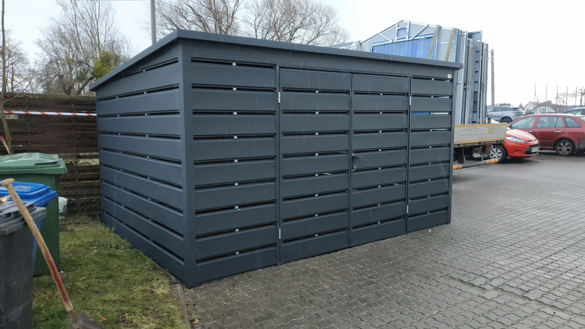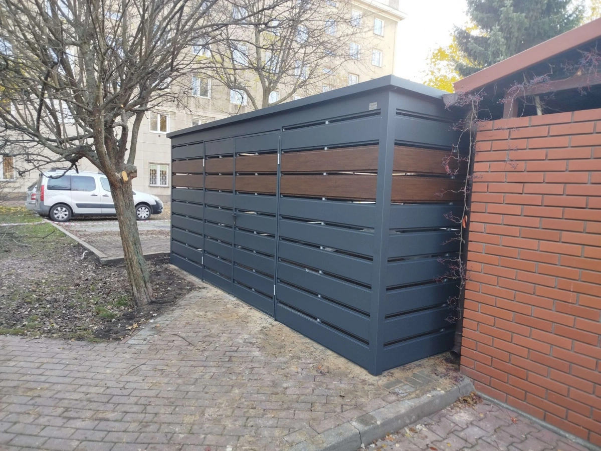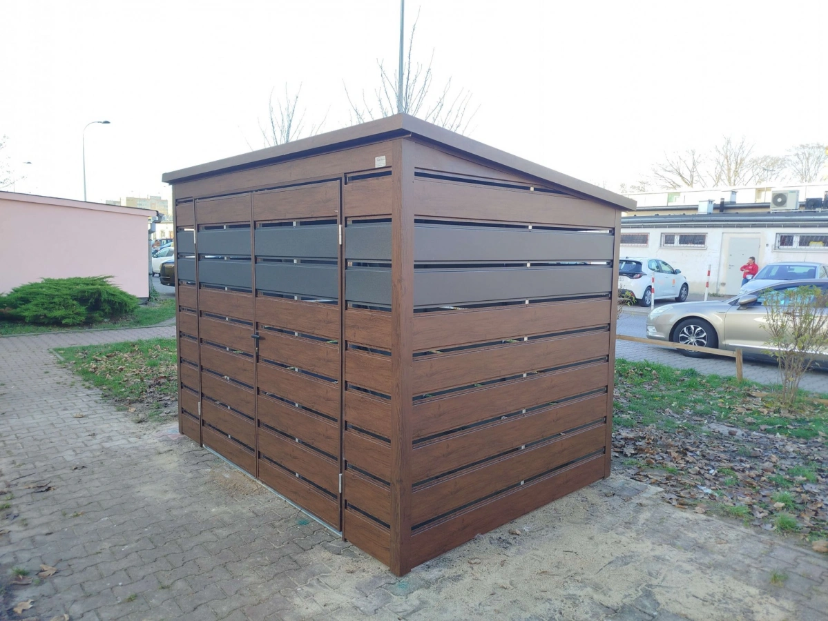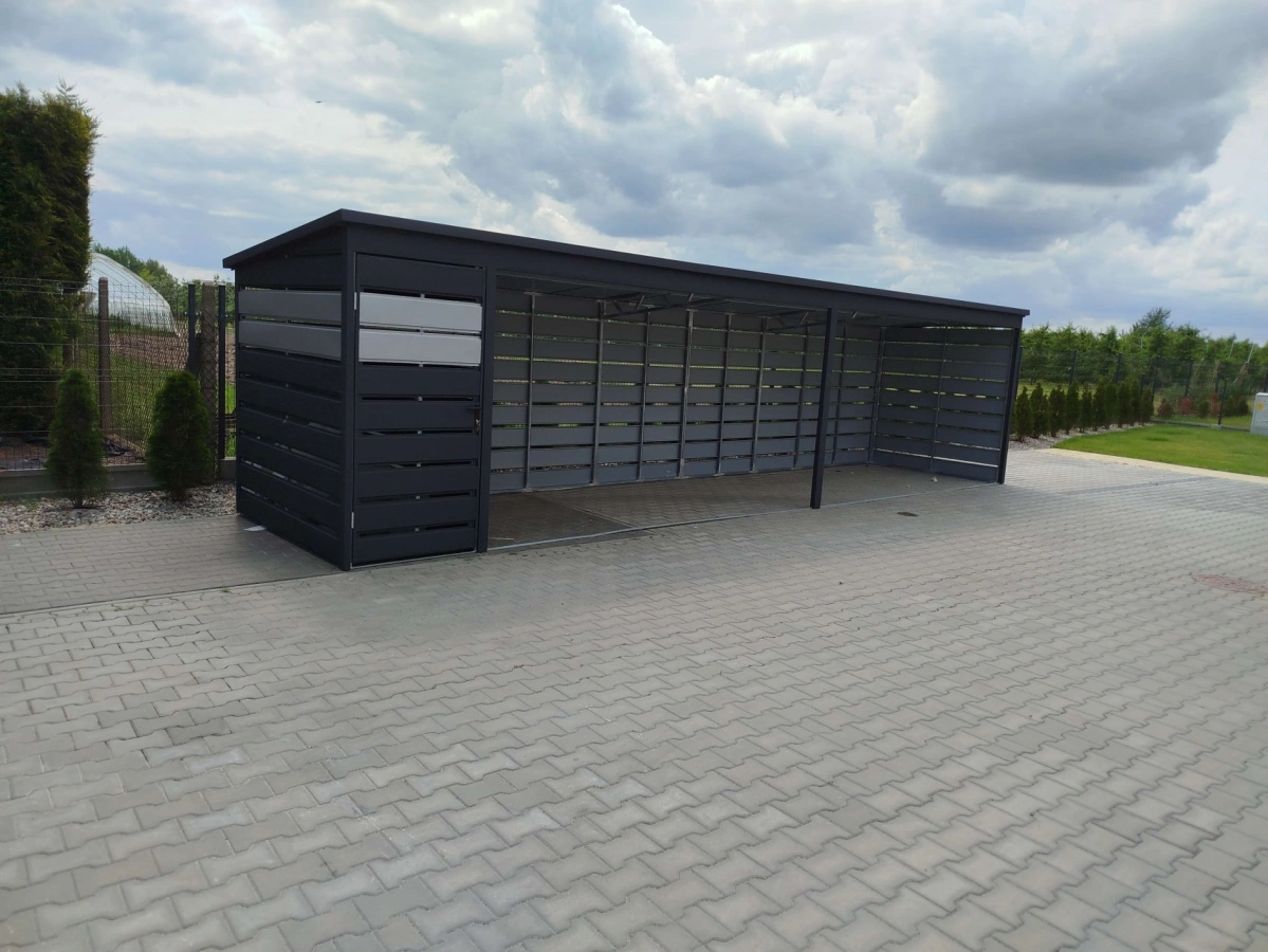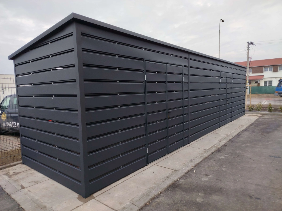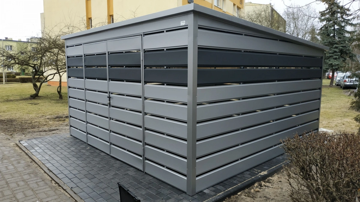 <p>Wiata śmietnikowa o wymiarach <strong>3m x 3m</strong> naszej produkcji to nowoczesny i estetyczny sposób na przechowywanie koszy na śmieci. </p> <ul> <li>Wymiary są odpowiednio dobrane do wielkości pojemników 240 l lub 1100 l, zapewniając porządek we wnętrzu. </li> <li>Szeroka brama (standardowo 2m, ale możliwe są również inne wymiary) pozwala na swobodne wyciąganie i wkładanie koszy na śmieci do środka.</li> <li>Jednospadowy dach (ze spadkiem ku tyłowi) ułatwia usuwanie śniegu i odprowadzanie deszczu.</li> <li>Mocna konstrukcja jest odporna na warunki atmosferyczne i trwała. Profile zamknięte, ocynkowane ogniowo gwarantują jej sztywność, stabilność i elegancki wygląd. </li> </ul> <p>Wiata nadaje się do wykorzystania w charakterze schowka ogrodowego, pomieszczenia na rowery lub małego magazynku (jest zamykana na klucz). Można ją wykonać według Państwa specyfikacji i w wybranej indywidualnie kolorystyce, by jeszcze lepiej komponowała się z otoczeniem.</p>