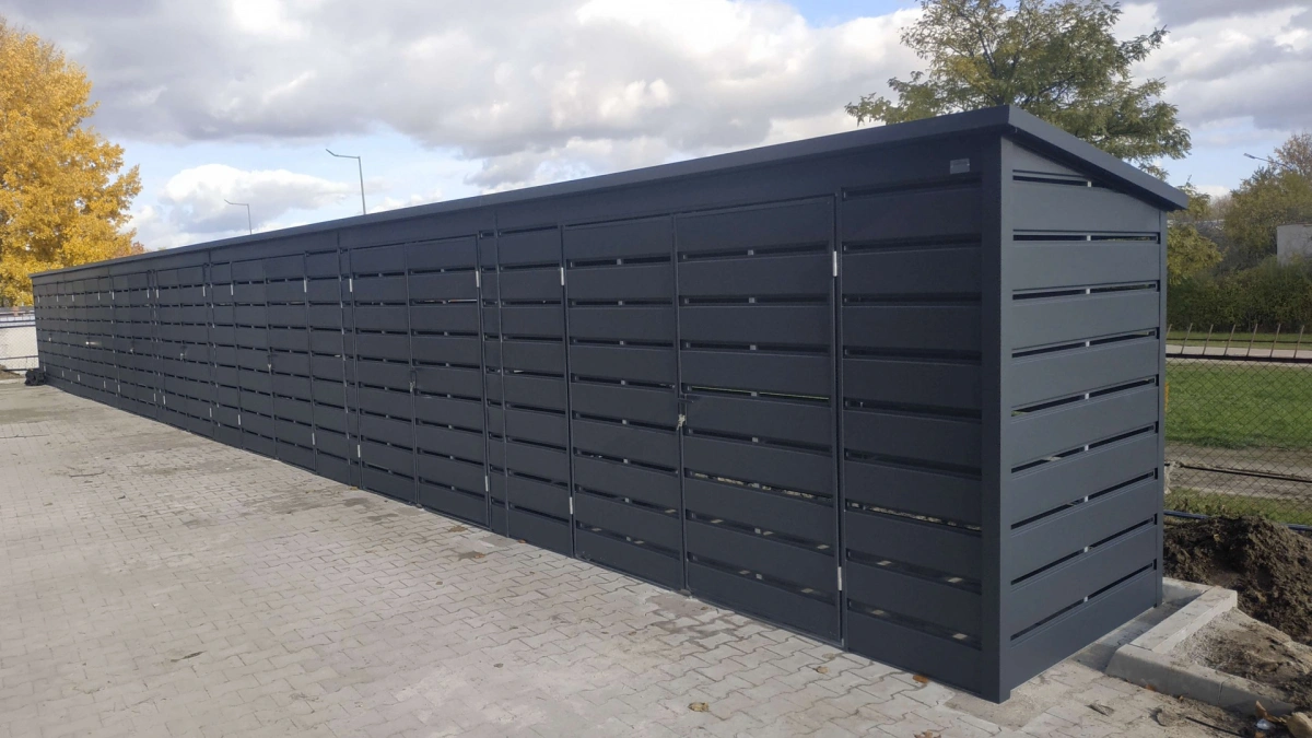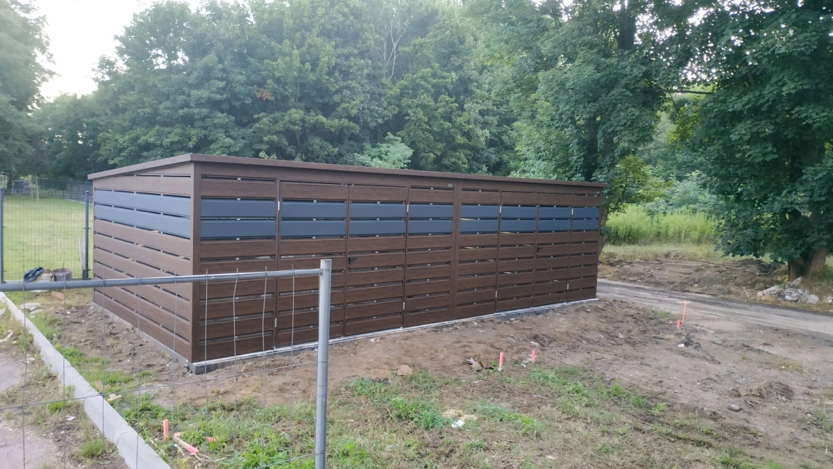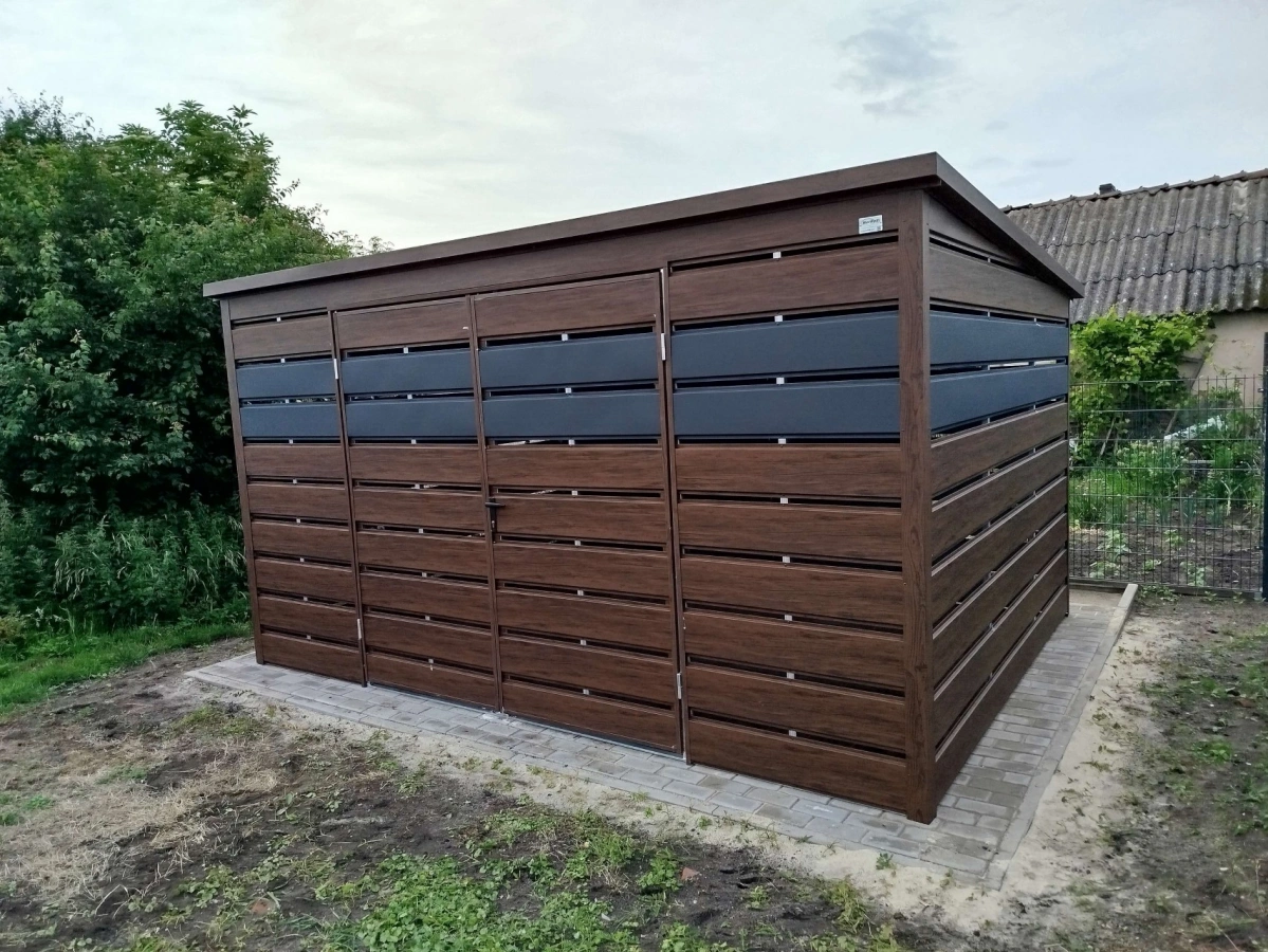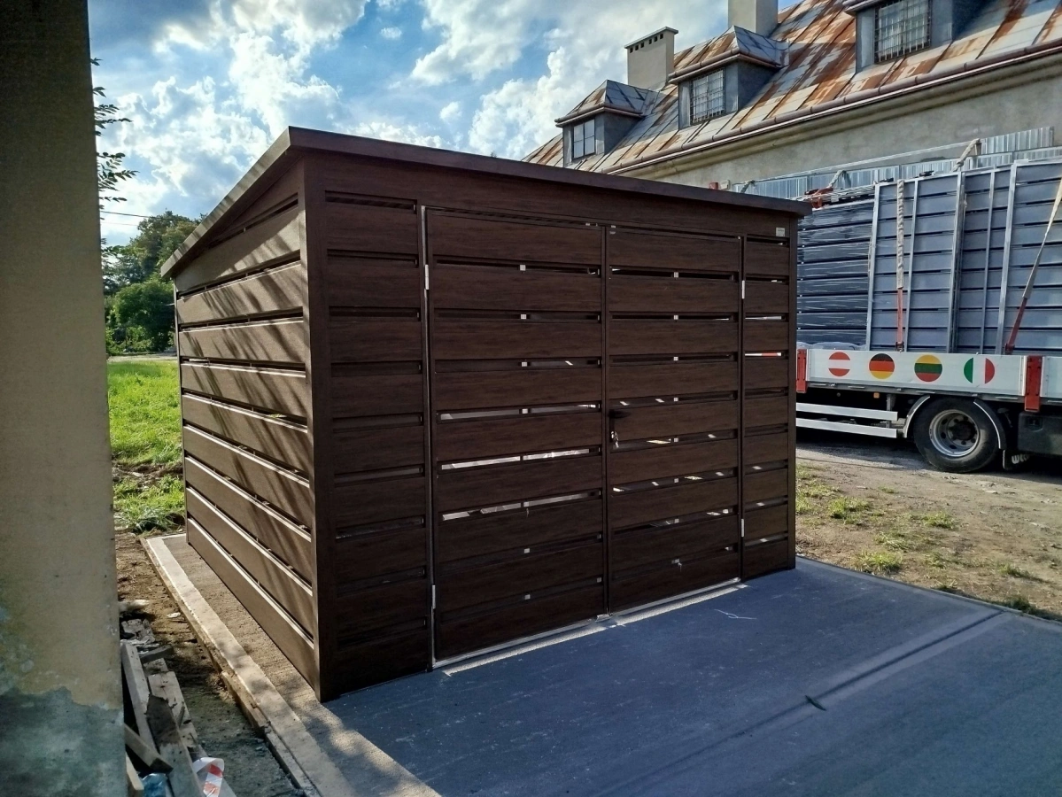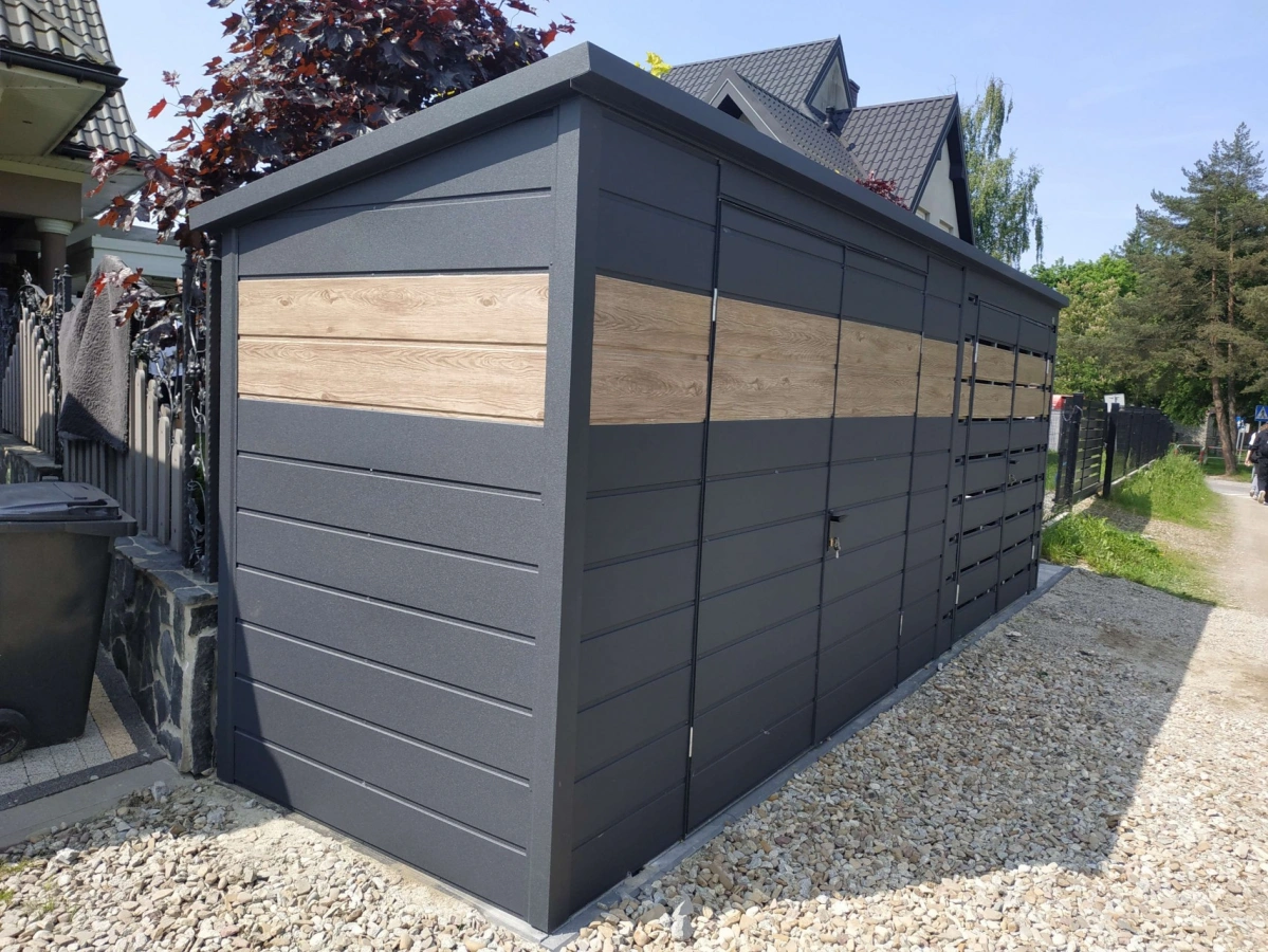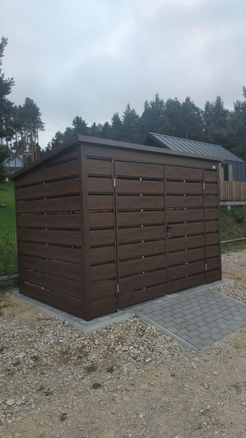 <p>Wiata śmietnikowa o wymiarach <strong>3m x 3m</strong> naszej produkcji to nowoczesny i estetyczny sposób na przechowywanie koszy na śmieci. </p> <ul> <li>Wymiary są odpowiednio dobrane do wielkości pojemników 240 l lub 1100 l, zapewniając porządek we wnętrzu. </li> <li>Szeroka brama (standardowo 2m, ale możliwe są również inne wymiary) pozwala na swobodne wyciąganie i wkładanie koszy na śmieci do środka.</li> <li>Jednospadowy dach (ze spadkiem ku tyłowi) ułatwia usuwanie śniegu i odprowadzanie deszczu.</li> <li>Mocna konstrukcja jest odporna na warunki atmosferyczne i trwała. Profile zamknięte, ocynkowane ogniowo gwarantują jej sztywność, stabilność i elegancki wygląd. </li> </ul> <p>Wiata nadaje się do wykorzystania w charakterze schowka ogrodowego, pomieszczenia na rowery lub małego magazynku (jest zamykana na klucz). Można ją wykonać według Państwa specyfikacji i w wybranej indywidualnie kolorystyce, by jeszcze lepiej komponowała się z otoczeniem.</p>
